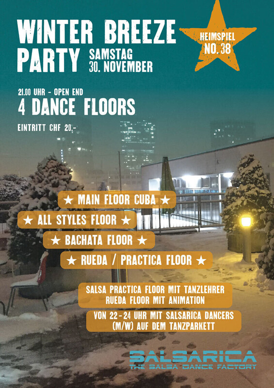 Heimspiel No. 38 - Winter Breeze Erlebe den Winter Breeze auf unseren 4 Dancefloors und tanze die Kälte weg! - Samstag 30. November 24 - Ab 21:00 Uhr - Open End - Eintritt: CHF 20.- Line up: - Main Floor Cuba DJ Manuel (ab 21 Uhr) - Salsa All Style Floor DJ Giovanni (ab 22 Uhr) - Bachata Floor DJ Desea (ab 22 Uhr) - Kizomba Floor DJ Nandes (ab 23 Uhr) Zusätzlich für euch im Programm: - 21 - 22 Uhr SalsaPractica - 22 - 23 Uhr Rueda de Casino Floor mit Animation Unsere SalsaRica Dancers sind von 22 bis 24 Uhr im Main Floor für euch am Start. Sie tragen rote SalsaRica T-Shirts, einfach schnappen und tanzen:) Schüler der Kursperiode, in der das jeweilige Heimspiel stattfindet, erhalten beim Bezahlen des Kurses einen Gutschein, mit dem sie für 5.- (anstatt 20.-) ans Heimspiel können. Pro Jahr planen wir immer 4 Heimspiele, die man auf keinen Fall verpassen sollte. https://www.salsarica.ch/.../heimspiele-by-salsarica.html