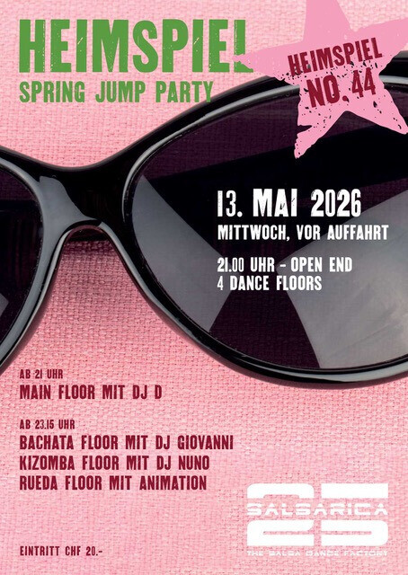 Heimspiel No. 44 - Spring Jump Party - Gemeinsam tauen wir den Winter auf! - Mittwoch 13. Mai 26 - Ab 21:00 Uhr - Open End - Eintritt: CHF 20.- Line up: - Main Floor Cuba DJ D (ab 21 Uhr) - Bachata Floor DJ Giovanni (ab 23:15 Uhr) - Kizomba Floor DJ Nuno (ab 23:15 Uhr) - Rueda Floor mit Animation (ab 23:15 Uhr) Zusätzlich für euch im Programm: - 22 - 24 Uhr SalsaRica Dancers im Main Floor - Rueda Floor mit Animation Unsere SalsaRica Dancers sind von 22 bis 24 Uhr im Main Floor für euch am Start. Sie tragen rote SalsaRica T-Shirts, einfach schnappen und tanzen:) Schüler der Kursperiode, in der das jeweilige Heimspiel stattfindet, erhalten beim Bezahlen des Kurses einen Gutschein, mit dem sie für 5.- (anstatt 20.-) ans Heimspiel können. Pro Jahr planen wir immer 4 Heimspiele, die man auf keinen Fall verpassen sollte. Weitere Infos: https://www.salsarica.ch/.../heimspiele-by-salsarica.html