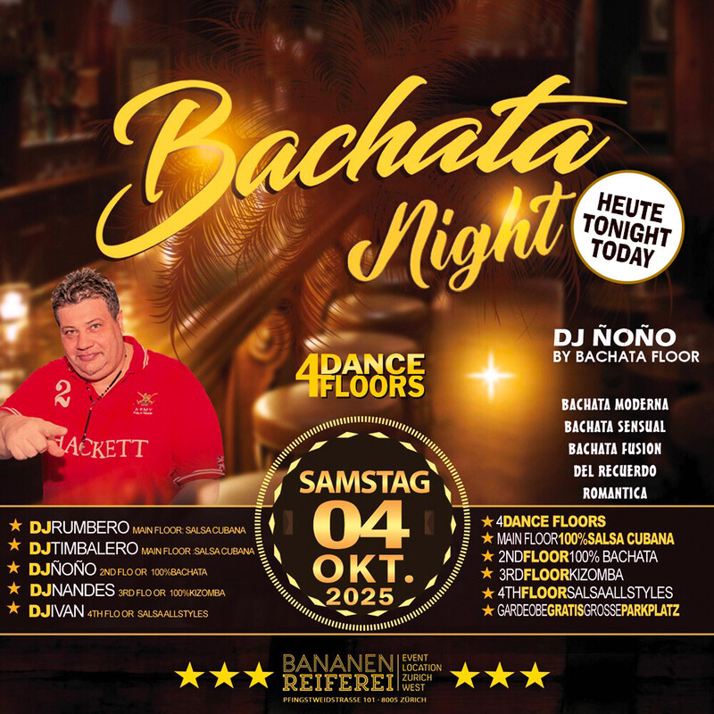 HEUTE / TODAY / ESTA NOCHE ✪✪✪ ✪ HAVANA NIGHT ✪ DJs Rumbero & Timbalero Bananenreiferei (4 Floors) ● SAMSTAG 04. OKTOBER 2025 ● 4 DANCE FLOORS ✪✪✪ ● AB 22 JAHREN ● DOORS: 21:30 – 04:00 UHR ● EINTRITT CHF 20.- ● GRATIS GARDEROBE ● AUTO PARKPLÄTZE ● EINTRITT: BEZAHLUNG AN DER KASSE NUR BARGELD ● GETRÄNKE-BAR: BARGELD ✪✪✪ ● MAIN FLOOR: HAVANA NIGHT ● DJ RUMBERO ● DJ TIMBALERO 100%Salsa Cubana - Timba - Cubaton – Fiesta ✪✪✪ ● 2nd FLOOR: 100% BACHATA ● DJ ÑOÑO Bachata Fusion - Moderna - Clasica del Recuerdo ✪✪✪ ● 3RD FLOOR: KIZOMBA NIGHT: ● DJ NANDES Kizomba, Semba, Tarraxinha, Afrohouse, Urban Kiz ✪✪✪ ● 4TH FLOOR: SALSA ALLSTYLES ● DJ IVAN Salsa Allstyles, Clasica, Puertorriqueña, Romantica ✪✪✪ BANANENREIFEREI Pfingstweidstrasse 101 8005 Zürich ✪✪✪ Bienvenidos Juanes Events https://juanesevents.ch/2-0-Events.html