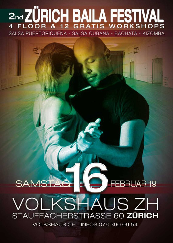 Por segunda vez consecutiva, presentamos en la ciudad de Zürich, el Zürich Baila Festival 2019, con el apoyo de algunas de las escuelas de Salsa con mas renombre de Suiza, con las cuales ofreceremos Workshop totalmente gratuitos para todo el que desee. Tambien disponemos de 4 salas con 4 ambientes musicales diferentes desde Bachata Sensual, Kizomba, Salsa Puertoriqueña y Salsa Cubana, en las cuales disponemos de los mejores Djs.