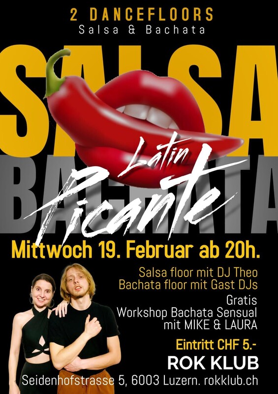 > Jeden Mittwoch < ★ LATIN PIKANTE ★ 2 Parkett Dance Floors von 20.30h. bis 23.30h. BACHATA SENSUAL WORKSHOP mit LAURA & MIKE (ab 20h.) Floor 1: 100% Salsa mit DJ Theo Floor 2: 100% Bachata mit Gast DJs Eintritt CHF 5.- ROK KLUB (Ex-Hotel Flora, Ex-Adagio Club) Seidenhofstrasse 5, 6003 Luzern www.rokklub.ch Rok ist dein neuer Club an der Seidenhofstrasse 5, im Herzen von Luzern! https://fb.me/e/2eWqvVTQC
