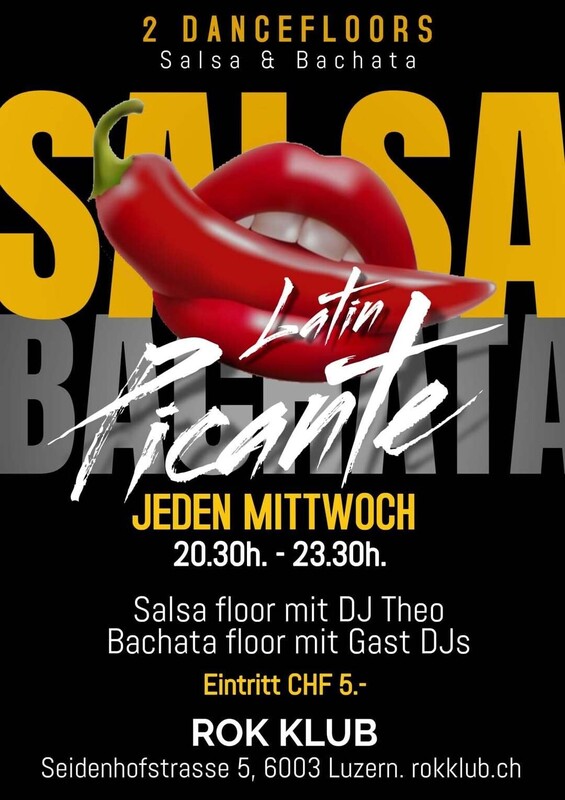> Jeden Mittwoch < ★ LATIN PIKANTE ★ 2 Parkett Dance floors von 20.30h. bis 23.30h. Floor 1: 100% Salsa mit DJ Theo Floor 2: 100% Bachata mit Gast DJs Eintritt CHF 5.- ROK KLUB (Ex-Hotel Flora, Ex-Adagio Club) Seidenhofstrasse 5, 6003 Luzern www.rokklub.ch Rok ist dein neuer Club an der Seidenhofstrasse 5, im Herzen von Luzern! https://fb.me/e/8vSxDDpix