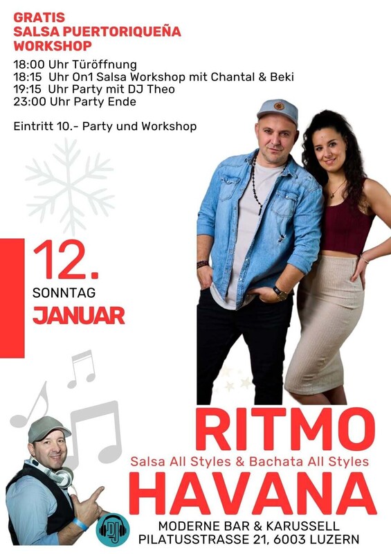 Jeden Sonntag im Herzen von Luzern. " RITMO HABANA " SALSA ALL STYLES & BACHATA ALL STYLES mit DJ Theo (Resident DJ) -------------------------------------------------------------- PROGRAMM: > 18:00 Uhr Türöffnung und Musik > 18:15 Uhr On1 Salsa Workshop mit Chantal & Beki > 19:15 Uhr Party mit DJ Theo > 23:00 Uhr Ende --------------------------------------------------------------- 18.00 Uhr bis 23.00 Uhr I Eintritt 10.- inklusive Workshop Im MODERNE trifft man sich an der Bar oder im Karussell im ehemaligen Kinosaal. MODERNE BAR & KARUSSELL Pilatusstrasse 21, 6003 Luzern, www.modernekarussell.ch ------------------------------------------------------------------- WIE FINDEN SIE UNS: -------------------------- Anreise mit: AUTO: Parkhaus Kantonalbank, 100 Meter Bahnhofparking P1+P2, 200 Meter BUS: Buslinie Nr. 1 ab Bahnhof Luzern - Kantonalbank (1 Station) ZUG: 200 Meter, drei Gehminuten ab Hauptbahnhof Luzern https://www.facebook.com/salsacongress/