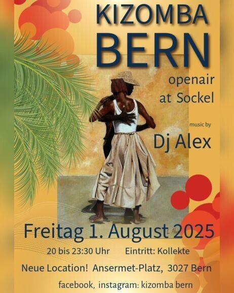Kizomba Bern openair auf dem Sockel in Bern 2025 Diesen Sommer findet zum vierten Mal Kizomba auf dem Sockel in Bern statt. Kommt und geniesst die lauen Sommerabende mit uns an verschiedenen Abenden zwischen Ende Juni bis Mitte September. Dj Alex spielt den ganzen Abend Kizomba und lädt euch zum tanzen ein. Am 01.08.25 findet von 19:45 bis 20:30 Uhr ein Kizomba workshop auf Kollekte Basis mit Walter statt. Getanzt wird dann bis 23:30 Uhr Eintritt: Kollekte Location: aus organisatorischen Gründen findet der Sockel im Sommer 2025 nicht auf dem Waisenhausplatz statt. NEUE LOCATION für 2025: Ansermet Platz, 2027 Bern. Tram 8 Richtung Bern Brünnen, direkt an der Haltestelle Gäbelbach. Parkmöglichkeiten in der Nähe vorhanden.