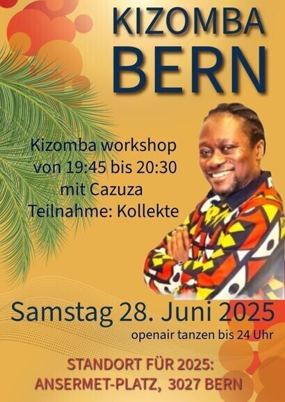 Kizomba Bern openair auf dem Sockel in Bern 2025 Diesen Sommer findet zum vierten Mal Kizomba auf dem Sockel in Bern statt. Kommt und geniesst die lauen Sommerabende mit uns an verschiedenen Abenden zwischen Ende Juni bis Mitte September. Dj Alex spielt den ganzen Abend Kizomba und lädt euch zum tanzen ein. Am 28.06.25 findet von 19:45 bis 20:30 Uhr ein Kizomba workshop auf Kollekte Basis mit Cazuza statt. Getanzt wird dann bis Mitternacht…. Eintritt: Kollekte Location: aus organisatorischen Gründen findet der Sockel im Sommer 2025 nicht auf dem Waisenhausplatz statt. NEUE LOCATION für 2025: Ansermet Platz, 2027 Bern. Tram 8 Richtung Bern Brünnen, direkt an der Haltestelle Gäbelbach. Parkmöglichkeiten in der Nähe vorhanden.