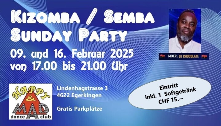 Wir tanzen am 9.2.2025 von 17:00 bis 21:00 Uhr Kizomba / Semba Eintritt 15.00 inlk. 1 Softgetränk im Dance Club Happy and Mad. Lindenhagstrasse 3, 4622 Egerkingen