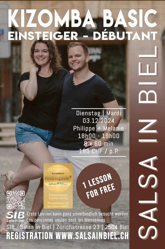 Kizomba Einsteiger mit Philippe und Melanie Start: Dienstag 03. Dezember 2024 Zeit: 18:00 - 19:00 Preis: CHF 180.- (8 x 60 Min) Erste Lektion kann ganz unverbindlich besucht werden! Einzelpersonen sind herzlichst willkommen. Anmeldung: https://anmeldung.salsainbiel.ch Weitere Informationen unter: https://www.salsainbiel.ch 𝗚𝗨𝗧 𝗭𝗨 𝗪𝗜𝗦𝗦𝗘𝗡! 𝘜𝘯𝘴𝘦𝘳𝘦 𝘛𝘢𝘯𝘻𝘴𝘤𝘩𝘶𝘭𝘦 𝘪𝘴𝘵 𝘰𝘧𝘧𝘪𝘻𝘪𝘦𝘭𝘭 𝘍𝘪𝘵𝘯𝘦𝘴𝘴𝘎𝘶𝘪𝘥𝘦 𝘻𝘦𝘳𝘵𝘪𝘧𝘪𝘻𝘪𝘦𝘳𝘵 𝘶𝘯𝘥 𝘴𝘰𝘮𝘪𝘵 𝘣𝘦𝘪 𝘥𝘦𝘯 𝘮𝘦𝘪𝘴𝘵𝘦𝘯 𝘒𝘳𝘢𝘯𝘬𝘦𝘯𝘬𝘢𝘴𝘴𝘦𝘯 𝘢𝘯𝘦𝘳𝘬𝘢𝘯𝘯𝘵. 𝘉𝘪𝘵𝘵𝘦 𝘦𝘳𝘬𝘶𝘯𝘥𝘪𝘨𝘦 𝘥𝘪𝘤𝘩 𝘣𝘦𝘪 𝘥𝘦𝘪𝘯𝘦𝘮 𝘝𝘦𝘳𝘴𝘪𝘤𝘩𝘦𝘳𝘦𝘳, 𝘸𝘦𝘭𝘤𝘩𝘦 𝘉𝘦𝘪𝘵𝘳ä𝘨𝘦 ü𝘣𝘦𝘳𝘯𝘰𝘮𝘮𝘦𝘯 𝘸𝘦𝘳𝘥𝘦𝘯 𝘶𝘯𝘥 𝘸𝘪𝘦 𝘩𝘰𝘤𝘩 𝘥𝘦𝘳 𝘈𝘯𝘵𝘦𝘪𝘭 𝘪𝘴𝘵. 𝘡𝘶𝘥𝘦𝘮 𝘪𝘯𝘧𝘰𝘳𝘮𝘪𝘦𝘳𝘦 𝘥𝘪𝘤𝘩 𝘥𝘢𝘳ü𝘣𝘦𝘳, 𝘸𝘦𝘭𝘤𝘩𝘦 𝘡𝘶𝘴𝘢𝘵𝘻𝘷𝘦𝘳𝘴𝘪𝘤𝘩𝘦𝘳𝘶𝘯𝘨 𝘥𝘶 𝘥𝘢𝘧ü𝘳 𝘮ö𝘨𝘭𝘪𝘤𝘩𝘦𝘳𝘸𝘦𝘪𝘴𝘦 𝘣𝘦𝘯ö𝘵𝘪𝘨𝘴𝘵. Link zur Fitness Guide: https://www.fitness-guide.ch/praeventionsbeitraege-der-krankenversicherer/kursanbieterabos ------------------------------ 🇫🇷 🇫🇷 🇫🇷 ------------------------------ Kizomba débutant avec Philippe et Melanie Début: Mardi 03 decembre 2024 Heure: 18h00 - 19h00 Prix: CHF 180.- (8 x 60 min) La première leçon peut être suivie sans engagement! Les personnes seules sont les bienvenues. Inscription: https://inscription.salsabienne.ch Pour plus d'informations: https://www.salsabienne.ch 𝗕𝗢𝗡 𝗔̀ 𝗦𝗔𝗩𝗢𝗜𝗥 ! 𝘕𝘰𝘵𝘳𝘦 é𝘤𝘰𝘭𝘦 𝘥𝘦 𝘥𝘢𝘯𝘴𝘦 𝘦𝘴𝘵 𝘰𝘧𝘧𝘪𝘤𝘪𝘦𝘭𝘭𝘦𝘮𝘦𝘯𝘵 𝘤𝘦𝘳𝘵𝘪𝘧𝘪é𝘦 𝘱𝘢𝘳 𝘍𝘪𝘵𝘯𝘦𝘴𝘴𝘎𝘶𝘪𝘥𝘦 𝘦𝘵 𝘦𝘴𝘵 𝘢𝘪𝘯𝘴𝘪 𝘳𝘦𝘤𝘰𝘯𝘯𝘶𝘦 𝘱𝘢𝘳 𝘭𝘢 𝘱𝘭𝘶𝘱𝘢𝘳𝘵 𝘥𝘦𝘴 𝘤𝘢𝘪𝘴𝘴𝘦𝘴 𝘥'𝘢𝘴𝘴𝘶𝘳𝘢𝘯𝘤𝘦 𝘮𝘢𝘭𝘢𝘥𝘪𝘦. 𝘝𝘦𝘶𝘪𝘭𝘭𝘦𝘻 𝘷𝘰𝘶𝘴 𝘳𝘦𝘯𝘴𝘦𝘪𝘨𝘯𝘦𝘳 𝘢𝘶𝘱𝘳è𝘴 𝘥𝘦 𝘷𝘰𝘵𝘳𝘦 𝘢𝘴𝘴𝘶𝘳𝘦𝘶𝘳 𝘴𝘶𝘳 𝘭𝘦𝘴 𝘤𝘰𝘯𝘵𝘳𝘪𝘣𝘶𝘵𝘪𝘰𝘯𝘴 𝘱𝘳𝘪𝘴𝘦𝘴 𝘦𝘯 𝘤𝘩𝘢𝘳𝘨𝘦 𝘦𝘵 𝘭𝘦 𝘱𝘰𝘶𝘳𝘤𝘦𝘯𝘵𝘢𝘨𝘦 𝘳𝘦𝘮𝘣𝘰𝘶𝘳𝘴é. 𝘐𝘯𝘧𝘰𝘳𝘮𝘦𝘻-𝘷𝘰𝘶𝘴 é𝘨𝘢𝘭𝘦𝘮𝘦𝘯𝘵 𝘴𝘶𝘳 𝘭𝘦𝘴 𝘢𝘴𝘴𝘶𝘳𝘢𝘯𝘤𝘦𝘴 𝘤𝘰𝘮𝘱𝘭é𝘮𝘦𝘯𝘵𝘢𝘪𝘳𝘦𝘴 𝘥𝘰𝘯𝘵 𝘷𝘰𝘶𝘴 𝘱𝘰𝘶𝘳𝘳𝘪𝘦𝘻 𝘢𝘷𝘰𝘪𝘳 𝘣𝘦𝘴𝘰𝘪𝘯 Lien vers le Fitness Guide: https://www.fitness-guide.ch/fr/contributions-de-prevention-sante/abonnements-des-prestataires-de-cours