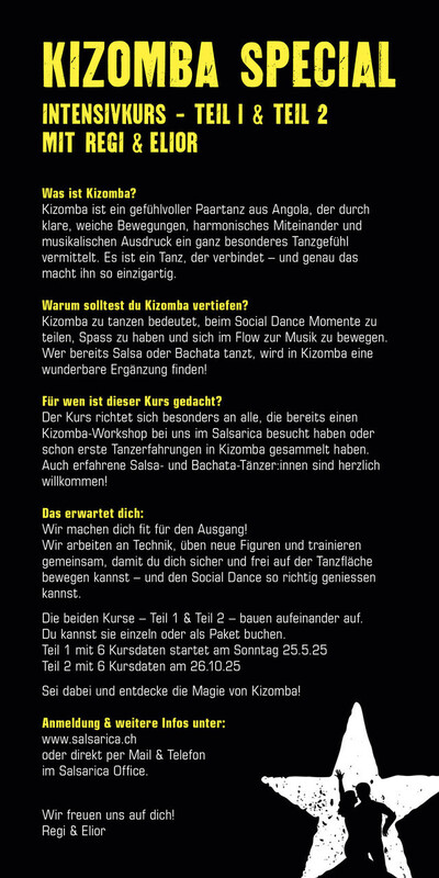 Basic Kizomba-Kenntnisse /Dieser Kurs eigenet sich für alle die bereits einen Kizomba-Workshop bei uns besucht haben oder die bereits Kizombaluft geschnuppert haben Kursstart: Sonntag 26. Oktober 2025 Kursdauer: 26. Oktober - 30. November 25 (6 MAL) Kurszeit: 14 - 16h Leitung: Regula & Elior Kurskosten pro Person: CHF 240.- / 12h Anmeldung unter: https://salsarica.ch/kurse/bachata-kizomba.html Wir freuen uns auf euch! Ergänzende Infos: Was ist Kizomba? Kizomba ist ein gefühlvoller Paartanz aus Angola, der durch klare, weiche Bewegungen, harmonisches Miteinander und musikalischen Ausdruck ein ganz besonderes Tanzgefühl vermittelt. Es ist ein Tanz, der verbindet – und genau das macht ihn so einzigartig. Warum solltest du Kizomba vertiefen? Kizomba zu tanzen bedeutet, beim Social Dance Momente zu teilen, Spaß zu haben und sich im Flow zur Musik zu bewegen. Wer bereits Salsa oder Bachata tanzt, wird in Kizomba eine wunderbare Ergänzung finden! Für wen ist dieser Kurs gedacht? Der Kurs richtet sich besonders an alle, die bereits einen Kizomba-Workshop bei uns im Salsarica besucht haben oder schon erste Tanzerfahrungen in Kizomba gesammelt haben. Auch erfahrene Salsa- und Bachata-Tänzer:innen sind herzlich willkommen! Das erwartet dich: Wir machen dich fit für den Ausgang! Wir arbeiten an Technik, üben neue Figuren und trainieren gemeinsam, damit du dich sicher und frei auf der Tanzfläche bewegen kannst – und den Social Dance so richtig genießen kannst https://salsarica.ch/kurse/bachata-kizomba.html