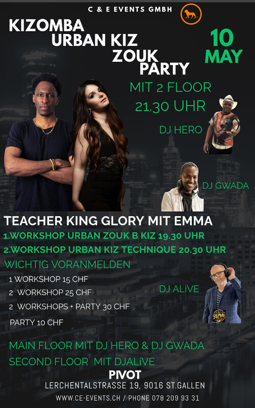 🔥 Mit Urban Kiz Teacher King Glory und Emma! 🔥 Am Samstag den 10. Mai hast du die Gelegenheit, mit Gloire Musenga, bekannt als King Glory und Emma zu tanzen und zu lernen! Diese erfahrenen Urban-Kiz- und Kizomba-Teachers aus Straßburg werden euch mit Freundlichkeit und offener Persönlichkeit begeistern🤩 📍 Location: Pivot, Lerchentalstrasse 19, 9016 St.Gallen 🕔 Workshops & Party: 🔹 19.30 – 20.30 Uhr: Urban Zouk B Kiz 🔹 20.30 – 21.30 Uhr: Urban Kiz Technique 🔹 Ab 21.30 Uhr Party – Lass uns gemeinsam tanzen! Main Floor mit DJ Hero und DJ Gwada mit Kizomba, Urban Kiz uvm. Second Floor mit DJ Alive mit Zouk 🎟 Preise: ✔ 1 Workshop 15 CHF ✔ 2 Workshops 25 CHF ✔ 2 Workshops + Party 30 CHF ✔ Party 10 CHF 💃🕺 Open Level – Jeder ist willkommen! Keine Erfahrungen in Urban Kiz und Zouk nötig! Nutze diese besondere Gelegenheit, deine Tanz Skills zu verbessern und neue Moves zu lernen. Tickets: https://eventfrog.ch/de/p/party/latin-brasil/kizomba-urban-kiz-party-night-in-st-gallen-7318215493600456134.html Für mehr Informationen Phone: info@ce-events.ch oder Phone +41 78 209 93 31 C & E Events GmbH / Pivot Mach dich bereit für einen unvergesslichen Tanzabend mit King Glory und Emma! 🔥✨
