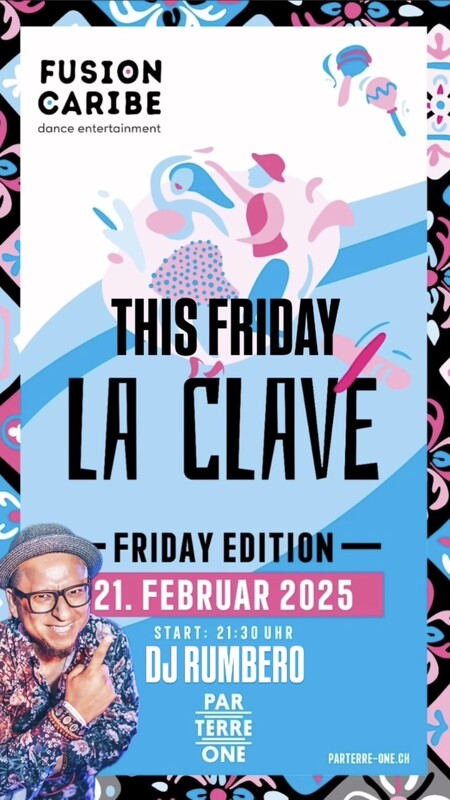 Heisse Rhythmen und lateinamerikanische Lebensfreude erwarten dich im Parterre One. Tanze zu heissen Salsa-Rhythmen, Timba, Bachata, Son Cubano, Reparto und mehr. Diese Nächte versprechen Leidenschaft und pure Tanzfreude!​ ​ NEU im PARTERRE ONE! 1 x Mal im Monat freitags - Friday Edition - NEU! Freitag, 21. Februar 2025 mit DJ RUMBERO 21:30 Uhr - circa 02:00 Uhr Eintritt: 15.- CHF (Cash oder Twint) ​ LA CLAVE wird präsentiert von „Katja Savastano - Fusión Caribe Dance Entertainment“ in Zusammenarbeit mit Parterre One Music. https://www.fusioncaribe.com/events
