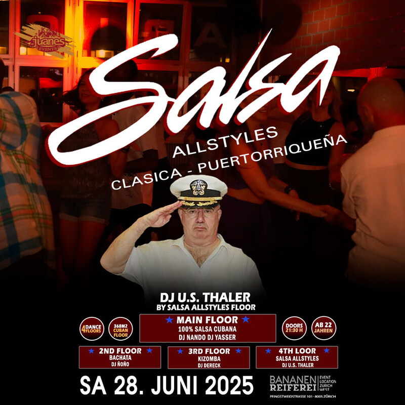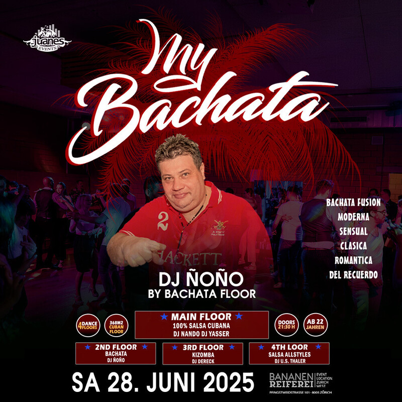 ★ LA NOCHE DE CUBA ★ DJ NANDO DJ YASSER Animation by Mijail Galano Bananenreiferei. SAMSTAG 28. JUNI 2025 ★★★ ● 4 Dance Floors ● AB 22 JAHREN ● DOORS: 21:30 – 04:00 UHR ● EINTRITT CHF 20.- ● GRATIS GARDEROBE ● 400 AUTO PARKPLÄTZE ● EINTRITT: BEZAHLUNG AN DER KASSE NUR BARGELD ● GETRÄNKE-BAR: BARGELD & CREDITCARD ★★★ CUBAN DANCE ANIMATION BY MIJAIL GALANO (Cuba) ★★★ ● 1-MAIN FLOOR: * 100% CUBANO ● DJ NANDO ● DJ YASSER 100% Salsa Cubana, Timba – Rumba - Fiesta ★★★ ● 2ND FLOOR: BACHATA: ● DJ ÑOÑO 100% Bachata Fusion, Moderna, Clasica, del Recuerdo ★★★ ● 3RD FLOOR: KIZOMBA: ● DJ DERECK Kizomba - Semba - Tarraxinha - Afrohouse - Urban Kiz ★★★ ● 4TH FLOOR: SALSA ALLSTYLES ● DJ U.S. THALER Salsa Allstyles, Puertorriqueña, Clasica, Mambo. ★★★ DATES 2025 LA NOCHE DE CUBA ● Sa 26. Juli 2025 ● Sa 23. August 2025 ● Sa 27. September 2025 ● Sa 25. Oktober 2025 ● Sa 22. November 2025 ● Sa 27. Dezember 2025 ★★★ BANANENREIFEREI Pfingstweidstrasse 101 8005 Zürich ★★★ Bienvenidos Juanes Events