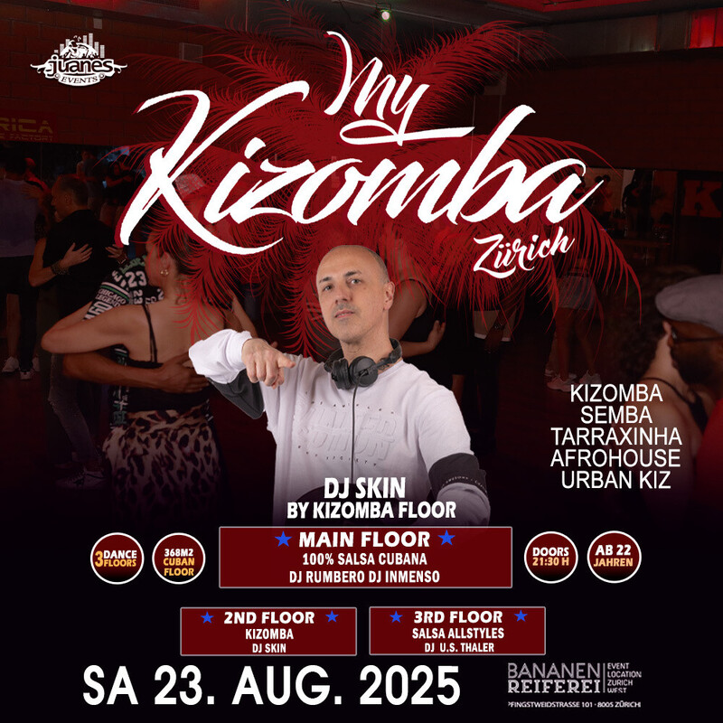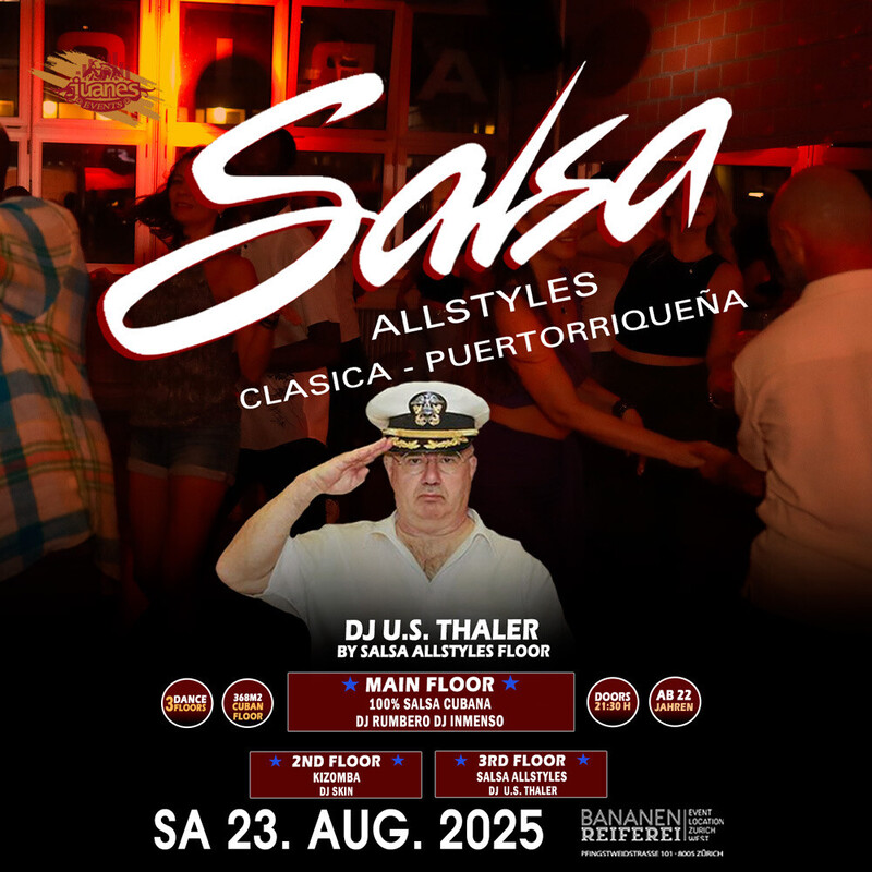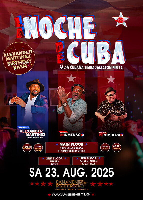 ★ LA NOCHE DE CUBA ★ DJs Rumbero & Inmenso, Birthday Bush Alexander Martinez Bananenreiferei. ★★★ SAMSTAG 23. AUGUST 2025 ★★★ ● 3 Dance Floors ● AB 22 JAHREN ● DOORS: 21:30 – 04:00 UHR ● EINTRITT CHF 20.- ● GRATIS GARDEROBE ● 400 AUTO PARKPLÄTZE ● EINTRITT: BEZAHLUNG AN DER KASSE NUR BARGELD ● GETRÄNKE-BAR: BARGELD & CREDITCARD ★★★ CUBAN DANCE ANIMATION BY ALEXANDER MARTINEZ ★★★ WIR WERDEN DEN GEBURTSTAG UNSERES FREUNDES ALEXANDER MARTINEZ FEIERN. ★★★ ● 1-MAIN FLOOR: * 100% CUBANO ● DJ RUMBERO ● DJ INMENSO 100% Salsa Cubana, Timba – Rumba - Fiesta ★★★ ● 2ND FLOOR: KIZOMBA: ● DJ SKIN Kizomba - Semba - Tarraxinha - Afrohouse - Urban Kiz ★★★ ● 3RD FLOOR: SALSA ALLSTYLES ● DJ U.S. THALER Salsa Allstyles, Puertorriqueña, Clasica, Mambo. ★★★ DATES 2025 LA NOCHE DE CUBA ● Sa 23. August 2025 ● Sa 27. September 2025 ● Sa 25. Oktober 2025 ● Sa 22. November 2025 ● Sa 27. Dezember 2025 ★★★ BANANENREIFEREI Pfingstweidstrasse 101 8005 Zürich ★★★ Bienvenidos Juanes Events https://juanesevents.ch/2-0-Events.html