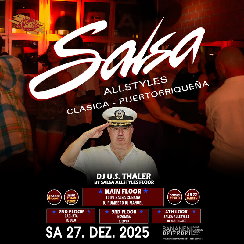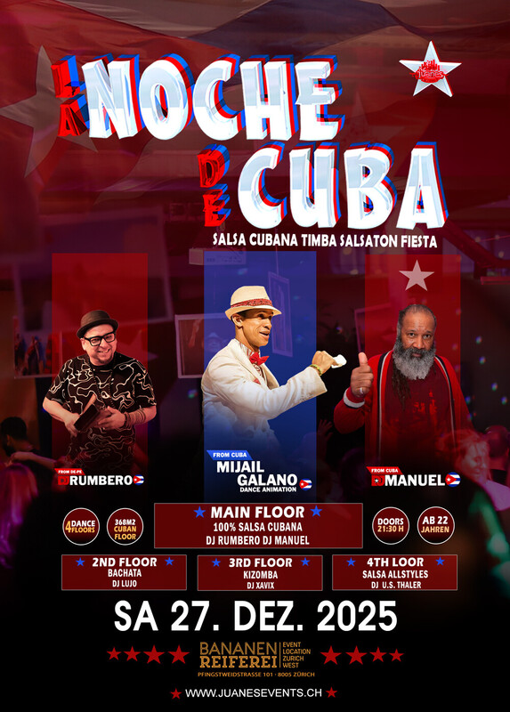 ★ LA NOCHE DE CUBA ★ DJs Rumbero & Manuel Bananenreiferei by Juanes SAMSTAG 27. DEZEMBER 2025 ★★★ ★ 4 Dance Floors ★ AB 22 JAHREN ★ DOORS: 21:30 – 04:00 UHR ★ EINTRITT CHF 20.- ★ GRATIS GARDEROBE ★ 400 AUTO PARKPLÄTZE ★ EINTRITT: BEZAHLUNG AN DER KASSE NUR BARGELD ★ GETRÄNKE-BAR: BARGELD & CREDITCARD ★★★ DANCE ANIMATION by MIJAIL GALANO (Cuba) ★★★ ★ 1-MAIN FLOOR: * 100% CUBANO ★ DJ RUMBERO ★ DJ MANUEL 100% Salsa Cubana, Timba – Rumba - Fiesta ★★★ ★ 2ND FLOOR: BACHATA: ★ DJ LUJO 100% Bachata Fusion, Moderna, Clasica, del Recuerdo ★★★ ★ 3RD FLOOR: KIZOMBA: ★ DJ XAVIX Kizomba - Semba - Tarraxinha - Afrohouse - Urban Kiz ★★★ ★4TH FLOOR: SALSA ALLSTYLES ★ DJ U.S. THALER Salsa Allstyles, Puertorriqueña, Clasica, Mambo. ★★★ BANANENREIFEREI Pfingstweidstrasse 101 8005 Zürich ★★★ Bienvenidos Juanes Events https://juanesevents.ch/