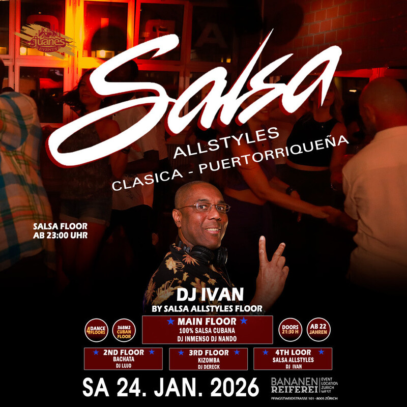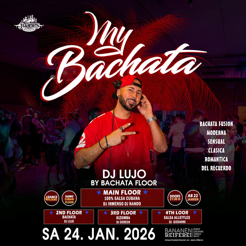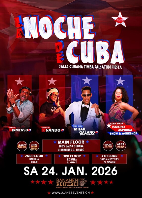 ★ LA NOCHE DE CUBA ★ DJs Inmenso & Nando - Show & Animation Bananenreiferei (4 Floors) SAMSTAG 24. JANUAR 2026 ●●● Cuba kehrt 2026 zurück – mit all der kubanischen Energie! Die Karibikinsel trägt Feuer, Lebensfreude, Fiesta und pure Rumba in ihren Adern und bringt dieses Lebensgefühl nach Zürich. Dank Juanes können wir diese wunderschöne Kultur durch ihre heißen und mitreißenden Rhythmen erleben. Genau deshalb lässt dich LA NOCHE DE CUBA jede Ausgabe so genießen, als wärst du mitten in Havanna. ●●● ★ 4 Dance Floors ★ AB 22 JAHREN ★ DOORS: 21:30 – 04:00 UHR ★ EINTRITT CHF 20.- ★ GRATIS GARDEROBE ★ 400 AUTO PARKPLÄTZE ★ EINTRITT: BEZAHLUNG AN DER KASSE NUR BARGELD ★ GETRÄNKE-BAR: BARGELD & CREDITCARD ●●● VERLOSUNG / SORTEO 3X TICKETS LEONI TORRES KONZERT 28. FEB. 26 AURA CLUB ZÜRICH ●●● WORKSHOP BY ISMARAY ASPISIRNA (Cuba) 20:30 bis 21:30 Uhr . RUMBA CON SALSA . INTERMEDIATE Sie brauchen nicht zu buchen, kommen Sie direkt zum Bananenreiferei am Samstag 24. Januar 2026 um 20:15 Uhr. Der Workshop Preis ist CHF 25.- Inkl. Garderobe & Party auf 4 Dance Floors. ●●● 00:00 UHR SHOW BY ISMARAY ASPIRINA LA RUMBA NO MUERE ●●● DANCE ANIMATION by MIJAIL GALANO (Cuba) ★★★ ★ 1-MAIN FLOOR: * 100% CUBANO ★ DJ INMENSO ★ DJ NANDO 100% Salsa Cubana, Timba – Rumba - Fiesta ●●● ★ 2ND FLOOR: BACHATA: ★ DJ LUJO 100% Bachata Fusion, Moderna, Clasica, del Recuerdo ●●● ★ 3RD FLOOR: KIZOMBA: ★ DJ XAVIX Kizomba - Semba - Tarraxinha - Afrohouse - Urban Kiz ●●● ★4TH FLOOR: SALSA ALLSTYLES ★ DJ IVAN Salsa Allstyles, Puertorriqueña, Clasica, Mambo. ●●● BANANENREIFEREI Pfingstweidstrasse 101 8005 Zürich ●●● DATES 2026 LA NOCHE DE CUBA ● Sa 24. Januar 2026 ● Sa 28. Februar 2026 ● Sa 28. März 2026 ● Sa 25. April 2026 ● Sa 23. Mai 2026 ● Sa 27. Juni 2026 ● Sa 25. Juli 2026 ● Sa 22. August 2026 ● Sa 26. September 2026 ● Sa 24. Oktober 2026 ● Sa 28. November 2026 ● Sa 26. Dezember 2026 ★★★ FOLLOW ME https://www.instagram.com/noche_cubana_juanes/ ★★★ LIKE ME https://www.facebook.com/juanesevents ★★★ Bienvenidos Juanes Events https://juanesevents.ch/
