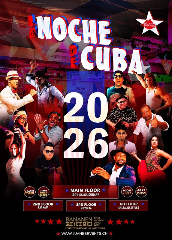 ★ LA NOCHE DE CUBA ★ kehrt 2026 zurück – mit all der kubanischen Energie! Die Karibikinsel trägt Feuer, Lebensfreude, Fiesta und pure Rumba in ihren Adern und bringt dieses Lebensgefühl nach Zürich. Dank Juanes können wir diese wunderschöne Kultur durch ihre heißen und mitreißenden Rhythmen erleben. Genau deshalb lässt dich LA NOCHE DE CUBA jede Ausgabe so genießen, als wärst du mitten in Havanna. Warum LA NOCHE DE CUBA? Weil wir dir ein einzigartiges Ambiente bieten – dekoriert im echten kubanischen Stil, mit den besten DJs aus Kuba und der ganzen Welt. Eine Organisation auf höchstem Niveau, mit bestem Service – speziell für unsere Salsa-Community in Zürich. Bienvenidos La NOCHE de CUBA 2026 ★★★ ★ LA NOCHE DE CUBA ★ Welcome 2026 Bananenreiferei by Juanes ★ 4 Dance Floors ★ AB 22 JAHREN ★ DOORS: 21:30 – 04:00 UHR ★ EINTRITT CHF 20.- ★ GRATIS GARDEROBE ★ 400 AUTO PARKPLÄTZE ★ EINTRITT: BEZAHLUNG AN DER KASSE NUR BARGELD ★ GETRÄNKE-BAR: BARGELD & CREDITCARD ★★★ MAIN FLOOR: CUBAN DANCE ANIMATION & SHOWS ★★★ ★ 1-MAIN FLOOR: * 100% CUBANO ★ DJ ★ DJ 100% Salsa Cubana, Timba – Rumba - Fiesta ★★★ ★ 2ND FLOOR: BACHATA: ★ DJ 100% Bachata Fusion, Moderna, Clasica, del Recuerdo ★★★ ★ 3RD FLOOR: KIZOMBA: ★ DJ Kizomba - Semba - Tarraxinha - Afrohouse - Urban Kiz ★★★ ★4TH FLOOR: SALSA ALLSTYLES ★ DJ Salsa Allstyles, Puertorriqueña, Clasica, Mambo. ★★★ DATES 2026 LA NOCHE DE CUBA ● Sa 24. Januar 2026 ● Sa 28. Februar 2026 ● Sa 28. März 2026 ● Sa 25. April 2026 ● Sa 23. Mai 2026 ● Sa 27. Juni 2026 ● Sa 25. Juli 2026 ● Sa 22. August 2026 ● Sa 26. September 2026 ● Sa 24. Oktober 2026 ● Sa 28. November 2026 ● Sa 26. Dezember 2026 ★★★ BANANENREIFEREI Pfingstweidstrasse 101 8005 Zürich ★★★ Bienvenidos Juanes Events https://juanesevents.ch/ https://juanesevents.ch/2-0-Events.html