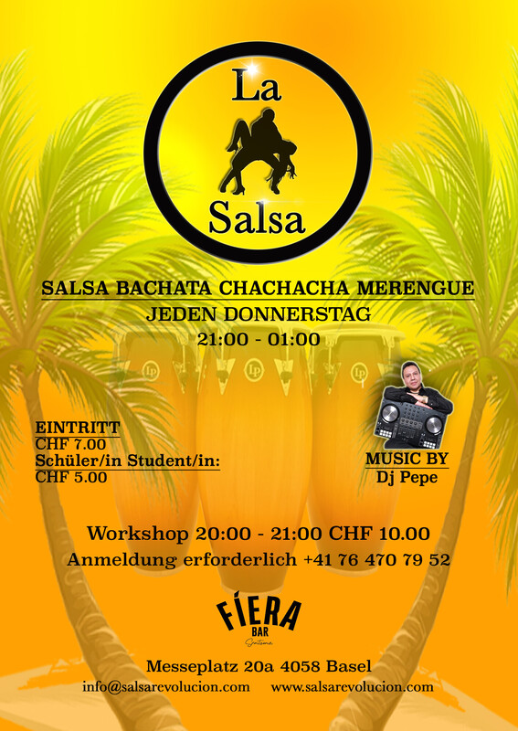 💃 LA SALSA – Neu in Basel! 💃 📅 Jeden Donnerstag 📍 Fiera Bar, Messeplatz Basel ✨ Workshop: 20:00–21:00 Uhr 🕺 Salsa Partnerwork (20 Plätze, Anmeldung erforderlich) 📞 Anmeldung: +41 76 470 79 52 | 💰 CHF 10.– p.P. 🎉 Party: 21:00–01:00 Uhr 🎧 Music by DJ Pepe 💰 Eintritt: CHF 7.– | Schüler/Studenten CHF 5.– 🔥 Freut euch auf Salsa Puertorriqueña, Bachata, Cha-Cha-Chá, Salsa Cubana & vieles mehr – mit der einzigartigen Musik von DJ Pepe! 🍹 Die Fiera Bar verwöhnt euch mit leckeren Drinks & Cocktails. 🚋 Zentral erreichbar – Tramlinien 2, 6, 14 & 15 bringen euch direkt zum Messeplatz. 💃 Ven a bailar con nosotros – te esperamos! Ein Abend voller Tanz, Spass & Latin Vibes wartet auf euch! 📞 Infos & Anmeldung: Yony – +41 76 470 79 52 🌐 www.salsarevolucion.com