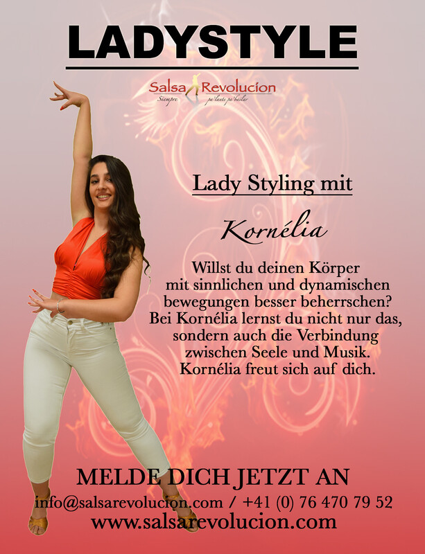 Salsa Lady Styling mit Kornélia Freitag 19.15-20.15 Open Level Preis Einzellektion: 25 CHF. Komplett-Kurs 11 Wochen: 220 CHF für Einzelpersonen. Ermässigung für Schüler, Studenten & Lehrlinge 20%. kostenlose Probelektion möglich. Teil des Revolución Pass. In diesem für Frauen exklusiven Salsa-Kurs lernst du die sinnliche Seite von lateinamerikanischen Tänzen wie Salsa, Bachata und Cha-Cha-Cha kennen, und klassischem Tanz. Du lernst nicht nur weiche, sinnliche Bewegungen, sondern auch Hände, Arme, Schultern, Oberkörper, Drehungen, Schrittkombinationen, Musikinterpretation durch deinen Körper und die Entwicklung deines eigenen, selbstbewussten Tanz-Style, starke, stolze Bewegungen zu erlernen. Voraussetzung: Du beherrschst den Salsa Grundschritt, die du im Paartanz anwenden kannst, sind Ziel des Salsa-Kurses. Infos & Anmeldung +41 76 470 79 52 https://www.salsarevolucion.com/salsa-1