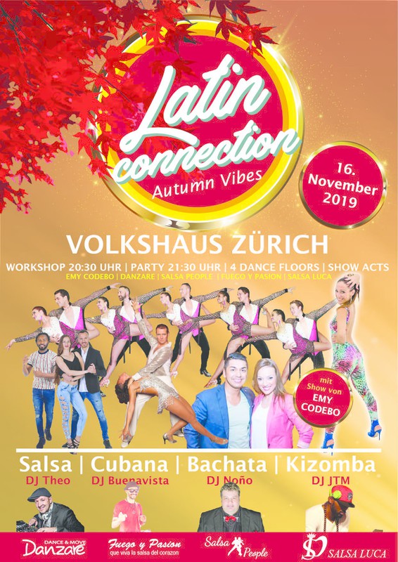 LATIN CONNECTION Herzlich Willkommen bei der Latin Connection im Volkshaus Zürich. Mit 4 Dance Floors. SAMSTAG 16.November 2019 ► Party auf 4 Dance Floors ab 22:00 Uhr ► 4 Gratis Workshops von 20:30h bis 21:30h ► Top Location ► Show Acts ► 4 Salsa, Bachata und Kizomba DJ‘s ► 8 Salsa, Bachata and Kizomba Teachers ♡ WELCOME AND ENJOY THE PARTY ♡ ► PARTY AUF 4 DANCE FLOORS AB 22:00 UHR • MAIN FLOOR: SALSA in Weisser Saal • Salsa Puertorriqueña, Salsa All-Styles, Salsa Romantica, Cha cha chá • mit DJ THEO • 2ND FLOOR: CUBANA in Blauer Saal • Salsa Cubana, Timba, Son, Cubaton • mit DJ Buenavista • 3RD FLOOR: BACHATA in Gelber Saal • 100% Bachata • mit DJ Ñoño • 4TH FLOOR: KIZOMBA in Grüner Saal • 100% Kizomba, Tarraxinha, Semba • mit DJ JTM ► LIVE ACTS ca. 24:00 Uhr in MAIN FLOOR ☆ Salsa Luca - Simona Solo Show ☆ Fuego y Pasion - Salsa Show ☆ Danzare - Bachata Show ☆ Salsa People - Pro-Team ☆ Emy Codebo - Solo Show ======================================== ► WORKSHOPS PROGRAMM 20:30H - 21:30H ALL LEVELS WS01 | Special paterns in salsa on 1 by Salsa Luca WS02 | Salsa Cubana by Fuego y Pasion WS03 | Bachata by Danzare WS04 | Kizomba by Salsa People ► PREIS Bis 1.November 2019 Full Pass 4 Gratis Workshops und Party CHF 20 Erhältlich bei den Latin Connection Partners und auf: https://eventfrog.ch/de/p/party/latin-brasil/latin-connection-autumn-vibes-6545238044704805615.html#!#ticket-container ► PREIS Ab 2.November 2019 Abendkasse (Nur Cash, keine EC oder Kreditkarte) Full Pass 4 Gratis Workshops und Party CHF 25 LOCATION: Volkshaus • Stauffacherstrasse 60 • 8004 Zürich • Volkshaus.ch