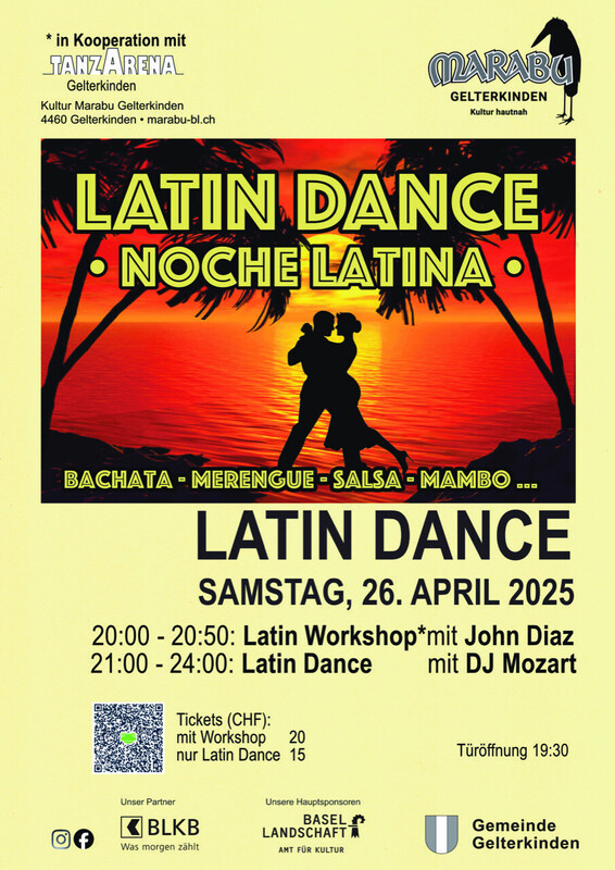 Latin Dance Liebe Salsa Freunde Am Samstag, 26. April startet das Marabu und DJ Mozart im wunderbarem ehemaligen Ambiente des alten Kinos Marabu wieder einen Latin-Salsa Event. Zum Start um 20.00h gibt es einen Latin Mix Work Shop mit dem bekannten Tänzer John Diaz (in Kooperation mit der Tanzschule TanzArena, Gelternkinden) Um zirka 21 Uhr beginnt dann die Party. Kosten: 20sfr.- mit Work Shop, nur Party 15sfr.- Weitere Daten im 2025 : Samstag, 14. Juni Samstag, 13. Sept. Samstag 1. Nov. Samstag 20. Dez. Das Marabu Team und DJ mozart heissen euch liebe Tänzerinnen und Tänzer und liebe Freunde der warmen und herzlichen "Music Latino" herzlich willkommen. Wir freuen uns auf euch. https://www.marabu-bl.ch https://www.marabu-bl.ch https://www.marabu-bl.ch https://www.marabu-bl.ch