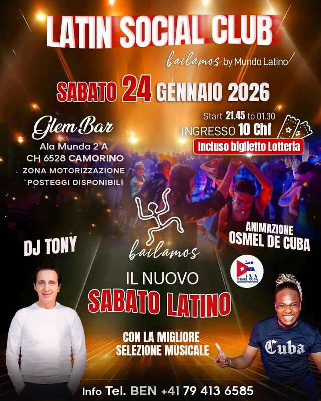 Glem Bar Franco Sellitto 24 de enero de 2026 21:45 Latin Social Club Precio de entrada: CHF 10.00 Share on Facebook Eventos sáb, 24. ene 21:45 Latin Social Club Glem Bar Camorino