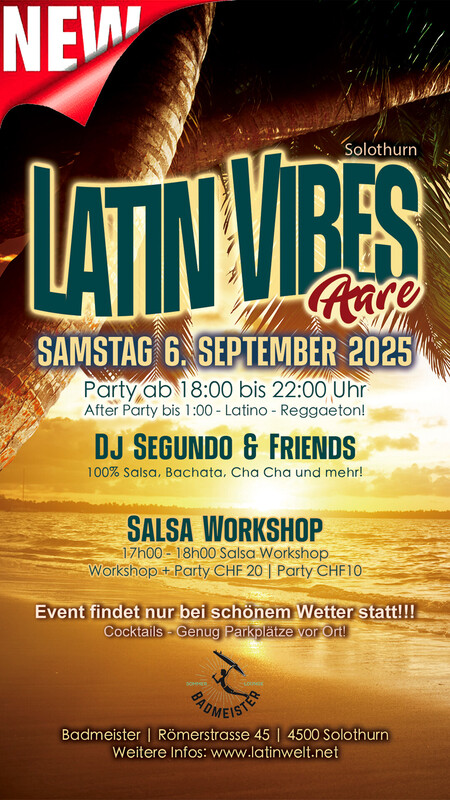 Latin Vibes Aare! Dein sommerliches Latin-Party-Event am Aare! 🌞 Die heißen Rhythmen von Salsa, Bachata und Merengue treffen auf die malerische Kulisse der Aare in Solothurn. Genieße einen Nachmittag und Abend voller guter Laune, mitreißender Musik und einer einmaligen Atmosphäre direkt am Fluss. Tanzen, erfrischende Drinks und das beste Ambiente am Wasser. Wir sehen uns dort! Datum: Samstag, 6. September 2025 Zeit: 17:00 Salsa Workshop | Ab 18:00 - 22:00 Uhr Party Ort: Badmeister Sommer Lounge Adresse: Römerstrasse 45, 4500 Solothurn Preise: CHF 20 Workshop + Party | CHF 10 Nur Party Bring deine Tanzlaune und genieße den Sonnenuntergang mit den besten Rhythmen! After Party bis 01:00 - Reggaeton, Latin House, Dembow, Merengue... #LatinVibesAare #Solothurn #LatinParty #Salsa #Bachata #SummerInSwitzerland #OpenAirSolothurn ESPAÑOL ¡Latin Vibes Aare! La fiesta latina de verano que esperabas. 🌞 El calor de la salsa, la pasión de la bachata y la energía del merengue llegan a la orilla del río Aare. Disfruta de una tarde llena de buena vibra, música contagiosa y un ambiente increíble frente al paisaje de Solothurn. Baile, bebidas refrescantes y el mejor ambiente junto al río. ¡No te lo pierdas! Fecha: Sábado, 6 de Septiembre 2025 Hora: 17:00 Bachata Workshop | 18:00h - 22:00h Fiesta Lugar: Bademeister Sommer Lounge Dirección: Römerstrasse 45, 4500 Solothurn Precios: CHF 20.- Workshop + Party | CHF 10.- Solo Fiesta ¡Trae tus ganas de bailar y disfruta del atardecer con el mejor ritmo! After Party bis 01:00 - Reggaeton, Latin House, Dembow, Merengue... #LatinVibesAare #Solothurn #FiestaLatina #Salsa #Bachata #VeranoEnSuiza #OpenAirSolothurn https://www.latinwelt.net/p/party.html https://www.latinwelt.net/p/latin-vibes-aare-solothurn.html