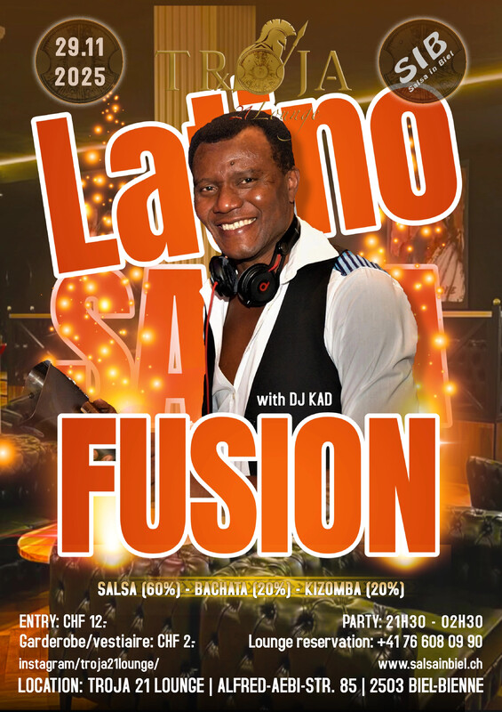 🌟 LATINO FUSION NIGHT – Salsa, Bachata, Kizomba & More! 🌟 Bereit für eine Nacht voller Rhythmus, Leidenschaft und karibischer Energie? Unsere Latino Fusion Night vereint die beliebtesten Latin- und Afro-Stile – eine perfekte Mischung für alle, die tanzen, feiern und die Musik spüren wollen! 🔥 Was dich erwartet: ✨ Eine heisse Fusion aus Salsa, Bachata, Kizomba & mehr ✨ Offene Tanzfläche für alle Levels – jede*r ist willkommen ✨ Tolle Community, gute Stimmung und viel Energie ✨ Drinks & Musik, die dich garantiert nicht stillstehen lassen 🗓 Datum: 29.11.2025 📍 Ort: Troja 21 Lounge, Alfred-Aebi-Strasse 85, 2503 Biel 🕘 Zeit: 21H30 bis 2h30 🎧 Musik: DJ KAD Egal ob du neu bist oder schon lange tanzt: Komm vorbei, geniesse den Flow und erlebe eine Nacht voller Freude, Bewegung und guten Vibes. 💃🕺 👉 Save the Date – Let’s dance, connect & celebrate! 🎟 Eintritt: 12 CHF 🧥Garderobe: 2 CHF Verpasse nicht diese einmalige Gelegenheit und sei dabei, wenn wir Biel mit unserer Latino Fusion Night zum Beben bringen! 🔥 Team SIB + Troja 21 Lounge 🇫🇷 🇫🇷 🇫🇷 🇫🇷 🇫🇷 🌟 LATINO FUSION NIGHT – Salsa, Bachata, Kizomba & More! 🌟 Prêt(e) pour une nuit pleine de rythme, de passion et d’énergie caribéenne ? Notre Latino Fusion Night réunit les styles latinos et afro les plus populaires – le mélange parfait pour tous ceux qui veulent danser, faire la fête et vibrer au son de la musique ! 🔥 Ce qui t’attend : ✨ Une fusion chaude de Salsa, Bachata, Kizomba & plus ✨ Une piste ouverte pour tous les niveaux – tout le monde est le/la bienvenu(e) ✨ Une superbe ambiance, une belle communauté et beaucoup d’énergie ✨ Des boissons & de la musique qui ne te laisseront pas rester immobile 🗓 Date : 29.11.2025 📍 Lieu : Troja 21 Lounge, Alfred-Aebi-Strasse 85, 2503 Bienne 🕘 Horaire : 21h30 à 2h30 🎧 Musique : DJ KAD Que tu sois débutant(e) ou danseur(se) expérimenté(e) : Viens profiter du flow et vivre une soirée pleine de joie, de mouvement et de good vibes. 💃🕺 👉 Save the Date – Let’s dance, connect & celebrate! 🎟 Entrée : 12 CHF 🧥 Vestiaire : 2 CHF Ne manque pas cette soirée unique et viens faire vibrer Bienne avec nous lors de la Latino Fusion Night ! 🔥 Team SIB + Troja 21 Lounge https://www.salsainbiel.ch/events/