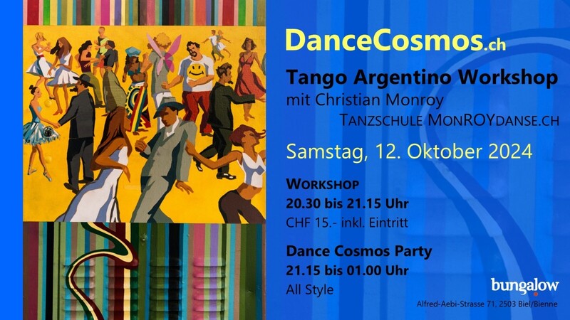 Es wird wieder Zeit übers Parkett zu schweben und zu heissen Rhythmen die Hüften zu schwingen. Unser DJ spielt Musik querbeet zum Tanzen der verschiedenen Gesellschaftstänze wie Discofox, Jive, Cha-Cha-Cha, Rumba, Salsa, Bachata, Kizomba, Samba, Tango Argentino, Mambo, Merengue aber auch Walzer, Foxtrott, Slowfox, Quickstep und viele mehr. Dies in einem zwanglos schönen Ambiente, zu modernem und schwungvollem Sound auf einer klimatisierten Tanzfläche Im Eintrittspreis ist ein attraktiver Tango Argentino Workshop inbegriffen. Lass Dich durch «MonROYdance» für diesen Tanz begeistern. Interessiert? Lass Dich überraschen und trage heute noch den Termin in deine Agenda ein! Vielleicht kommst Du zum ersten Mal, oder so wie viele immer wieder? So oder so – wir freuen uns auf Dich! Jetzt Tisch reservieren 👉🏼 https://dancecosmos.ch/?p=3553