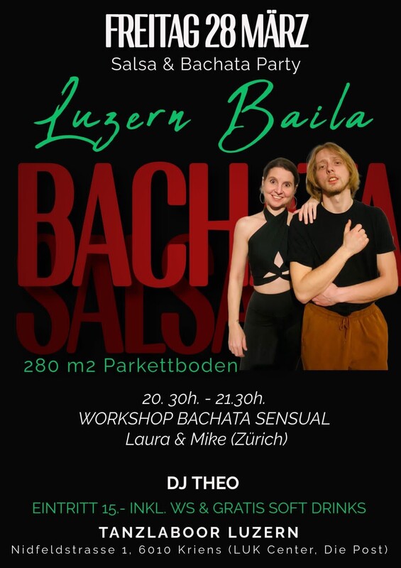 -- Freitag 28. März -- ★ LUZERN BAILA ★ ---------------------------------------------- TÜRÖFFNUNG 20h. ★ 20:30h.-21:30h. WORKSHOP BACHATA SENSUAL Mit Laura & Mike aus Zürich ★ SALSA & BACHATA FLOOR MIT DJ THEO --------------------------------------------------- - 280 m2 mit Parkettboden - 14 meter Spiegelwand und grossen Fenstern - Gratis Garderobe und Umkleideraum - Gratis Soft Getränken (Mineral Wasser, Cola, Eistee) ---------------------------------------------- ★ 20h. - 02h. EINTRITT 15.- Inkl. Workshop & Soft Getränke ★ TANZLABOOR LUZERN Nidfeldstrasse 1, 6010 Kriens ------------------------------------------------ "ANREISE WICHTIGE INFORMATIONEN" Die Anfahrt mit Fahrrad oder ÖV wird empfohlen. ÖV: Der Bus Nr. 14 fährt ab Bahnhof Luzern Richtung Horw Zentrum und die Haltestelle heisst Südpol. AUTO: Es steht nur eine beschränkte Anzahl Autoparkplätze für den Tanzlaboor zur Verfügung. Als Ausweichmöglichkeit empfehlen wir das "Parkhaus Nidfeld". https://fb.me/e/3bYOWwtI4