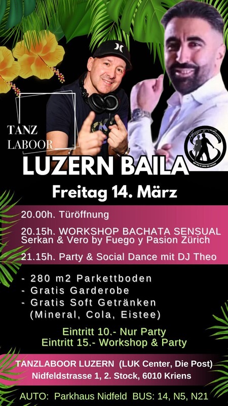 Freitag 14. März 2025 LUZERN BAILA & SOCIAL DANCE Salsa & Bachata Party mit DJ Theo -------------------------------------------- 20h. Türöffnung 20.15h. WORKSHOP BACHATA SENSUAL mit Serkan & Vero by Fuego y Pasion Tanzschule Zürich 21.15h. Party & Social Dance -------------------------------------------- - 280 m2 mit Parkettboden - 14 meter Spiegelwand und grossen Fenstern - Gratis Garderobe und Umkleideraum - Gratis Soft Getränken (Mineral Wasser, Cola, Eistee) ---------------------------------------------- EINTRITT 10.- Nur Party ab 21h. und Gratis Soft Getränke EINTRITT 15.- Inklusive Workshop, Party und Gratis Soft Getränk ---------------------------------------------- TANZLABOOR LUZERN (LUK Center, Die Post) Nidfeldstrasse 1, 2. Stock CH-6010 Kriens / Luzern www.tanzlaboor-luzern.ch (vis a vis Metzgercenter Zentralschweiz und Kampus Südpol) ----------------------------------------------- AUTO: Parkhaus Nidfeld, LUK Center Kriens, 50 Meter Entfernt ÖV: Kriens Südpol, Busse 14, N5, N21 https://fb.me/e/4fTnGdvLV