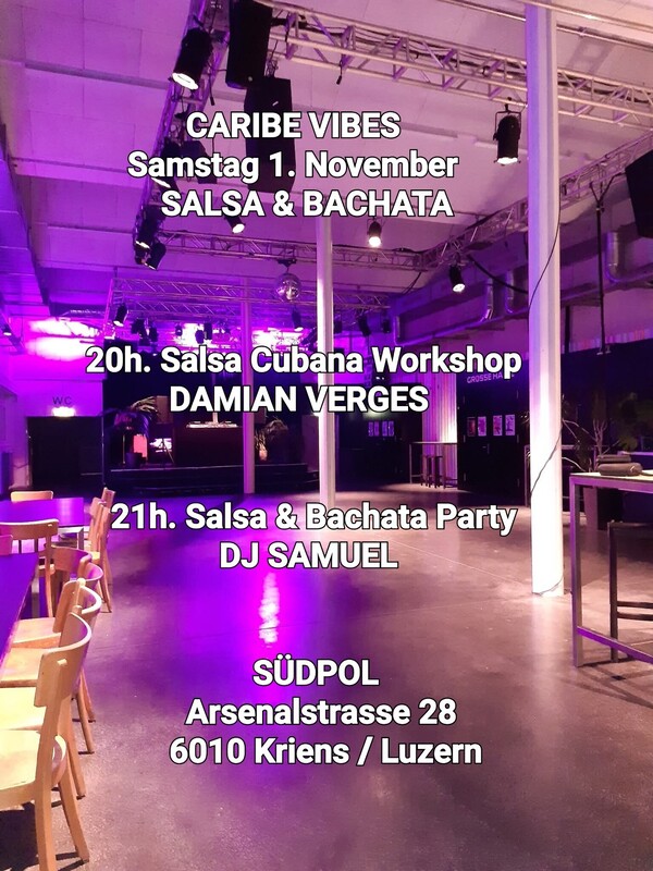 Samstag 1. November 2025 ★ CARIBE VIBES ★ Salsa & Bachata Tanzen im Südpol! Luzern ---------------------------------------------- 20h.-21h. WORKSHOP SALSA CUBANA mit DAMIAN VERGES 21h.-02h. SALSA & BACHATA PARTY mit DJ Samuel ---------------------------------------------- EINTRITT: Workshop & Party 20.- Party ab 21 Uhr nur 15.- Das Zentrum für Kultur in der Zentralschweiz. Mehrspartenhaus mit Tanz, Theater, Musik und Club. ★ SÜDPOL Arsenalstrasse 28, 6010 Kriens www.sudpol.ch ----------------------------------------------- "ANREISE WICHTIGE INFORMATIONEN" ----------------------------------------------- Die Anfahrt mit Fahrrad oder ÖV wird empfohlen. Eine Wegbeschreibung findest Du via Google Maps. VELO: Vor und hinter dem Gebäude befinden sich ca. 200 Fahrradparkplätze. Vom Stadtzentrum Luzern ist der Südpol in etwa zehn Minuten via Freigleis zu erreichen. ÖV: Der Bus Nr. 14 fährt ab Bahnhof Luzern Richtung Horw Zentrum und hält direkt vor dem Haus. Die Haltestelle heisst Südpol. AUTO: Es steht nur eine beschränkte Anzahl Autoparkplätze für den Südpol zur Verfügung. Diese befinden sich unter dem neuen LSO-Gebäude und zwischen Metzger Center Zentralschweiz und dem neuen Backsteingebäude der Hochschule Musik Luzern. Die Parkplätze auf dem Vorplatz des Metzger Center Zentralschweiz stehen den Südpol-Besucher*innen nicht zur Verfügung. Als Ausweichmöglichkeit empfehlen wir das "Parkhaus Nidfeld". https://fb.me/e/3Kbg1rXf3