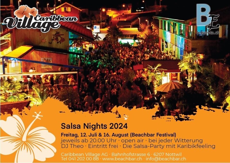 Freitag 16. August 2024 SALSA NIGHTS OPENAIR NOTTWIL MIT DJ THEO Lust auf eine unvergessliche Openair Partynacht mit karibischem Ambiente zwischen Palmen und Fackeln? Das legendär Salsa Night Openair Nottwil mit DJ Theo Die Openair Salsa Nights im Caribbean Village sind aus dem Eventkalender nicht mehr wegzudenken! Die Stimmung und Atmosphäre auf und neben der Tanzfläche ist unverwechselbar und auch für nicht Salsatänzer/innen ein Highlight! Freu dich auf lange Partynächte mit heissen Salsa-Rhythmen und coolen Drinks aus der Beachbar! Jeweils ab 20:00 Uhr bis am 02:00 Uhr und Eintritt Frei Salsa Nights Openair findet bei jeder Witterung statt (deckt) BEACHBAR NOTTWIL - beim Bahnhof am Sempachersee CARIBBEAN VILLAGE AG - Bahnhofplatz, CH-6207 Nottwil www.caribbean-village.ch https://www.facebook.com/share/UVaJWrsnWduwPHsA/