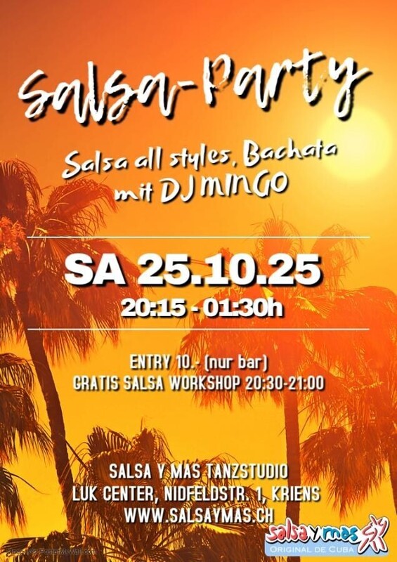 Samstag 25. Oktober 2025 SALSA & BACHATA Party mit DJ Mingo Salsa All Styles & Bachata All Styles Türöffnung 20h. 20:30h. bis 21:00h. Gratis Salsa Crash-Kurs mit Urbano 21:00h. - 01:30h. SALSA & BACHATA Party mit DJ Mingo EINTRITT 10.- (Nur Barzahlung) Salsa y Mas Tanzstudio im EG LUK CENTER, Nidfeldstrasse 1 6010 Kriens - Luzern www.salsaymas.ch ACHTUNG SEHR WICHTIG -------------------------------- Bei Anreise mit Auto Bitte Parkhaus Nidfeld nebenan benutzen Parkieren auf dem Areal ist Verboten! Bei Anreise mit ÖV Haltestelle Südpol: Bus Line 14 https://fb.me/e/hOGigoqXJ