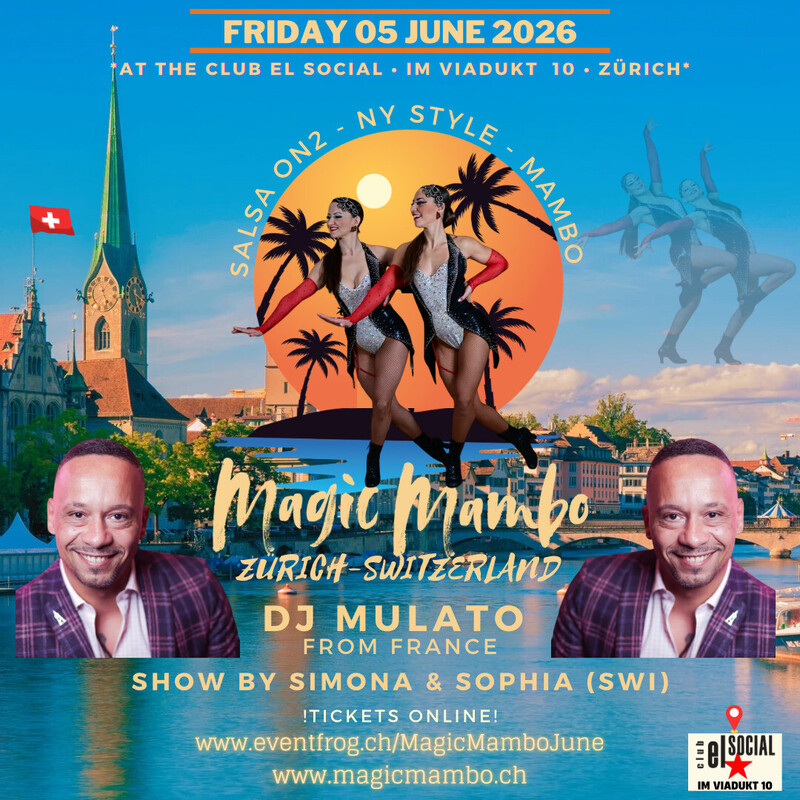 **Salsa On2 - NY Style - Mambo** ----------------- Music by DJ Mulato (Paris, France) Show by Simona & Sophia (Switzerland) ----------------- Tickets: www.eventfrog.ch/MagicMamboJune !Limited Capacity! ----------------- Info: www.magicmambo.ch www.magicmambo.ch