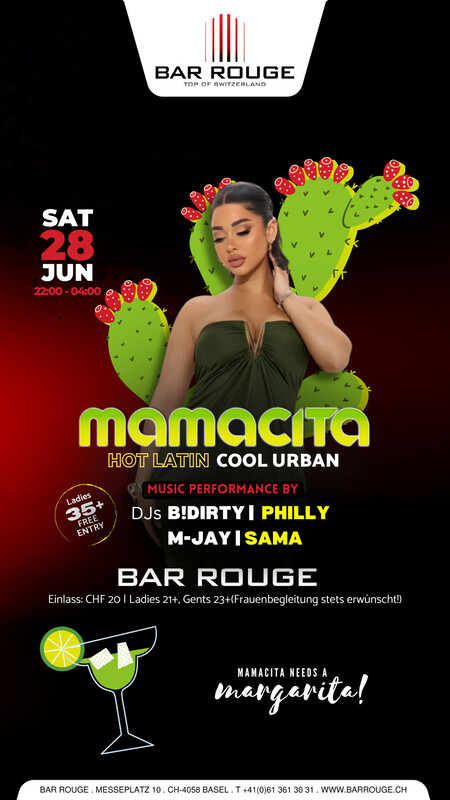 Arrrribaaa!! Diese Party ist schärfer als das mexikanische Essen! Komm und schwinge mit uns die Hüften zu den heissesten Latin Sounds der City. Wir wissen ganz genau wie heissblütig unsere Partygäste sind, weswegen es zur Abkühlung coolen Urban Sound & die besten Cocktails hoch über den Dächern von Basel gibt. Music: HOT LATIN & COOL URBAN https://www.barrouge.ch/de/events/Mamacita28062025/
