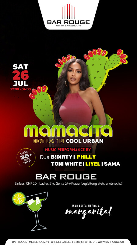 Arrrribaaa!! Diese Party ist schärfer als das mexikanische Essen! Komm und schwinge mit uns die Hüften zu den heissesten Latin Sounds der City. Wir wissen ganz genau wie heissblütig unsere Partygäste sind, weswegen es zur Abkühlung coolen Urban Sound & die besten Cocktails hoch über den Dächern von Basel gibt. Music: HOT LATIN & COOL URBAN https://www.barrouge.ch/de/events/Mamacita26072025/