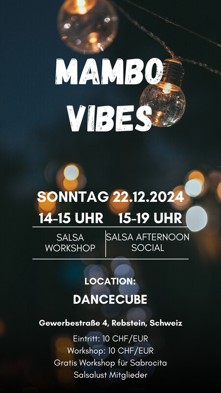 Es ist Zeit, nocheinmal gemeinsam zu tanzen und das Jahr mit guter Laune ausklingen zu lassen – und wir laden euch herzlich ein, dabei zu sein! Kommt vorbei zum ersten Afternoon Social – einem entspannten Nachmittag für alle Salsa- und Mambo-Begeisterten! Egal, ob ihr NY Style, L.A. Style, oder Cuban liebt – hier ist für alle Platz, um zu üben, zu tanzen und sich von tollen Rhythmen mitreißen zu lassen. *Wann?* Sonntag, 22. Dezember – ab 14:00 Uhr *Wo?* Dancecube Rebstein *Was euch erwartet:* Eine perfekt abgestimmte Playlist mit der Lieblingsmusik von Sabrocita & Camilo Eine gemütliche Lounge zum Chillen und Getränke genießen Jede Menge Zeit für den Austausch und gemeinsames Tanzen Und das Beste: Zu Beginn gibt es einen Salsa Fusion Workshop um 14 Uhr mit Camilo, der euch mit neuen Moves und Ideen rund um Afro & Salsa inspirieren wird! Danach geht’s direkt weiter zum freien Tanzen und gemeinsamen Feiern des Tanzjahres. Wir freuen uns auf einen wunderschönen Nachmittag mit euch – kommt, tanzt und lasst euch überraschen! Euer Sabrocita SalsaLust & Dancecube Team Eintritt Social: 10 CHF Workshop: 10 CHF (*gratis für Sabrocita Mitglieder) www.instagram.com/sabrocita_salsalust