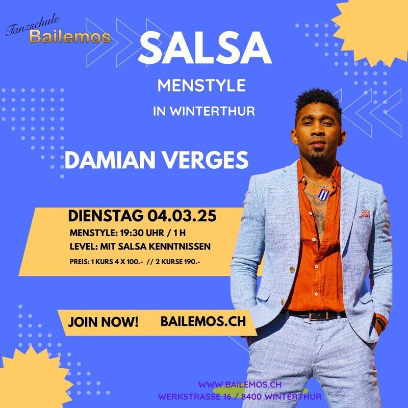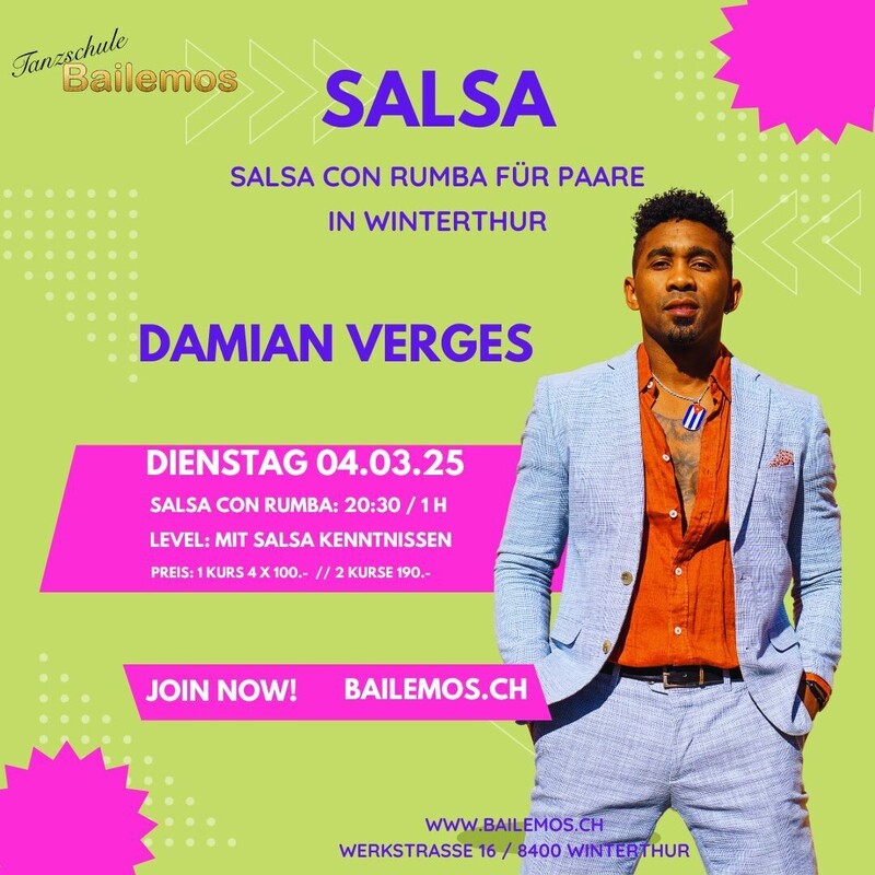Die Tanzschule bailemos freut sich riesig, Damian Verges bei uns begrüßen zu dürfen! Am Dienstag den 04.03.25 hast du die einmalige Gelegenheit, von seinem Können zu profitieren und deine Tanzskills auf das nächste Level zu bringen. 🎯 Programm: 19:30 Uhr - Manstyle: Entwickle deinen eigenen Stil! Lerne, dich elegant und selbstbewusst zu bewegen, musikalische Akzente zu erkennen und perfekt in deinen Tanz einzubauen. Ideal für alle mit Salsa-Erfahrung, die ihre tänzerischen Fähigkeiten erweitern möchten. 👉 Zur Anmeldung: https://bailemos.ch/salsa-menstyle/ 20:30 Uhr - Salsa con Rumba: Dieser Kurs ist für erfahrene Salsa-Tänzerinnen und Tänzer, die ihre Moves mit den rhythmischen Elementen der kubanischen Rumba und Salsa anreichern möchten. Perfekt, um deinem Tanzstil einen authentischen kubanischen Flair zu verleihen – egal ob als Leader oder Follower! https://bailemos.ch/salsa-af-13/ Melde dich schnell an und sichere dir deinen Platz in diesen besonderen Kursen! 💃🕺 www.bailemos.ch