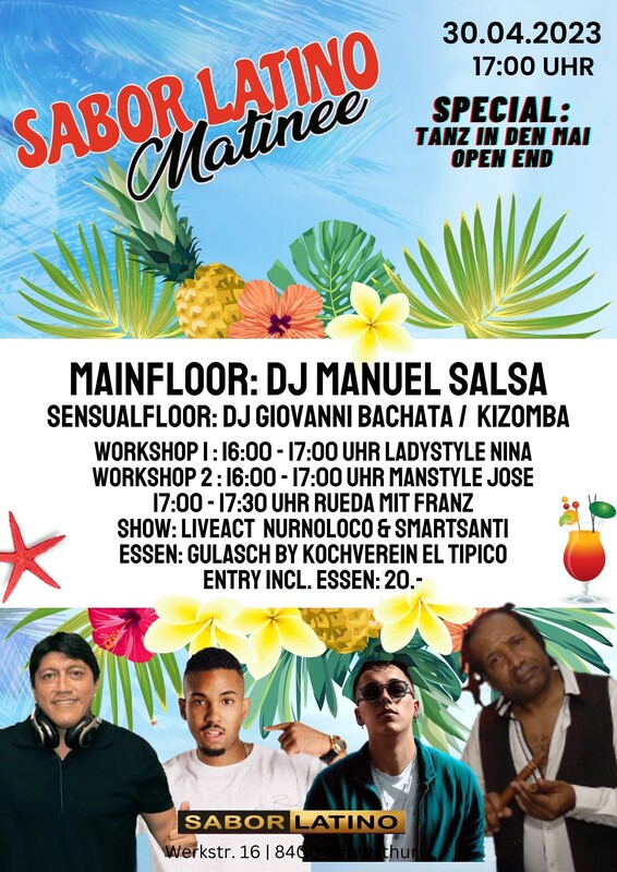 Hast du Lust auf eine Salsa, Bachata und Kizomba-Party, die dich zum Schwitzen bringt? Dann komm zum Sabor Latino Matinee! Hier gibt es nicht nur einen, sondern gleich zwei Dancefloors, auf denen du zu den heißen Rhythmen von DJ Manuel und DJ Paul das Tanzbein schwingen kannst. Aber bevor du dich in das Party-Getümmel stürzt, hast du die Möglichkeit, bei einem Lady oder Manstyle Workshop deine Tanz-Skills zu verbessern. Unsere professionellen Tanzlehrer werden dir zeigen, wie du dich elegant auf dem Parkett bewegst und dabei eine Menge Spaß hast. Danach darfst du dein Können beim Rueda ausprobieren und dein Glück beim Tanzen in der Gruppe versuchen. Und dann geht es auch schon los mit der Party! Zu den Klängen von DJ Manuel und Giovanni kannst du zu Salsa, Bachata und Kizomba tanzen, bis die Sohlen deiner Schuhe glühen. Aber das ist noch nicht alles: Wir haben noch einen Liveact von Nurnoloco u. Smartsani vorbereitet. Und wenn du zwischendurch eine Pause brauchst, kannst du Dir an der Bar einen feinen Cocktail gönnen und um 18:30 Uhr von den köstlichen Düften eines feinen Gulasch von unserem Kochverein el Tipico verführen lassen. Also komm vorbei und verbringe eine unvergessliche Zeit mit uns auf der Sabor Latino Matinee! Floor 1 DJ Manuel mit Salsa Floor 2 DJ Giovanni Bachata | Kizomba Liveact: Bachata by Nurnoloco & Smartsani Essen: Gulasch mit Kartoffeln 3 Workshops: 16:00 – 17:00 Uhr Ladystyle Nina 16:00 – 17:00 Uhr Manstyle Jose 17:00 – 17:30 Uhr Rueda mit Franz https://saborlatino.ch/event/sabor-latino-matinee/