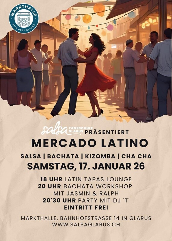 18:00 Tapas mit Latin-Lounge-Music 20:00 Bachata Workshop mit Jasmin & Ralph 20:30 - 00:30 Party mit DJ 'T'