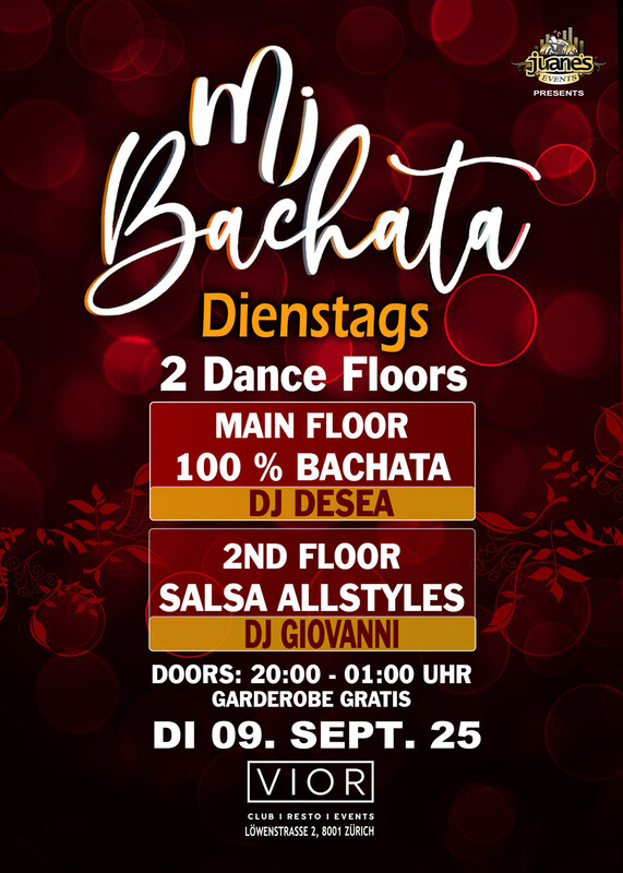 ♦ MI BACHATA ♦ Dienstags 100% Bachata 2 Floors VIOR CLUB ••• Unter der Woche darf unser romantischer und sinnlicher Tanz MI BACHATA im VIOR Club nicht fehlen. Jeden Dienstag verwandelt sich der Main Floor in ein Paradies für alle Bachateros – mit den besten DJs der Szene. Mit 2 Tanzflächen wird die Nacht im Herzen von Zürich einfach perfekt. ••• ♦ MAIN FLOOR: 100% BACHATA DJ DESEA • Bachata Moderna, Fusion, Clasica y del Recuerdo. •••• ♦ 2ND FLOOR: SALSA ALLSTYLES DJ GIOVANNI • Salsa Allstyles - Cubana - Clasica - Puertorriqueña •••• ♦ Doors: 20:00 bis 01:00 Uhr ♦ Garderobe Gratis ♦ Eintritt Party CHF 10.- Inkl. Garderobe •••• • EINTRITT: BEZAHLUNG AN DER KASSE NUR BARGELD. •••• Location: VIOR CLUB Löwenstrasse 2 8001 Zürich •••• Bienvenidos MI BACHATA by Juanes Events https://juanesevents.ch/2-0-Events.html
