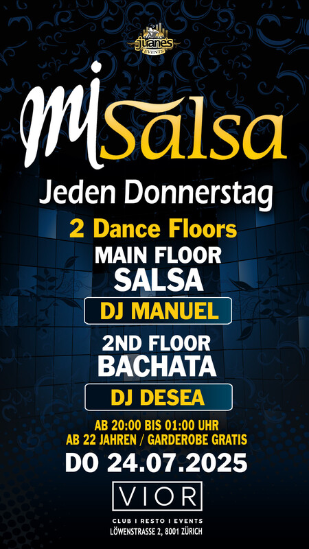 ► MI SALSA ◄ Jeden Donnerstag 2 Floors VIOR CLUB DONNERSTAG 24. JULI 25 ••• ► MAIN FLOOR: SALSA ALLSTYLES DJ MANUEL • Salsa Allstyles - Cubana - Clasica - Puertorriqueña •••• ► 2ND FLOOR: BACHATA DJ DESEA • Bachata Moderna, Fusion, Clasica y del Recuerdo. •••• • 2 Grosse Tanzflächen • Grosse Salsa Floor • Grosse Bachata Floor • Doors: 20:00 bis 01:00 Uhr • Garderobe Gratis • Eintritt Party CHF 10.- Inkl. Garderobe •••• • EINTRITT: BEZAHLUNG AN DER KASSE NUR BARGELD. •••• BACHATA FLOOR: Die Bachata-Tanzfläche befindet sich im Untergeschoss, es ist eine grosse und gemütliche Tanzfläche für die Bachata-Tänzer. •••• GARDEROBE: Die Garderobe befindet sich im Untergeschoss, neben der Bachata-Tanzfläche (Garderobe ist gratis). •••• AUDIO TON: Das Audio ist perfekt, professioneller Sound eines echten Clubs. •••• Location: VIOR CLUB Löwenstrasse 2 8001 Zürich •••• SEARCH MAP https://map.search.ch/Z%C3%BCrich,L%C3%B6wenstr.2 •••• Bienvenidos Mi Salsa by Juanes Events. https://juanesevents.ch/2-0-Events.html