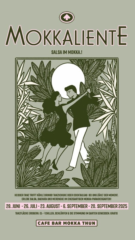 Geniesse im wunderschönen Mokka Garten Openair (bei gutem Wetter) oder im aussergewöhnlichen Mokkahaus (bei schlechtem Wetter) Salsa-/Bachatamusik. Pack deine Tanzlust mit ein und komm vorbei. Jeweils 19.00 - 22.00 Uhr Dj, Afterpartys und weitere Infos unter https://mokka.ch/ https://mokka.ch/