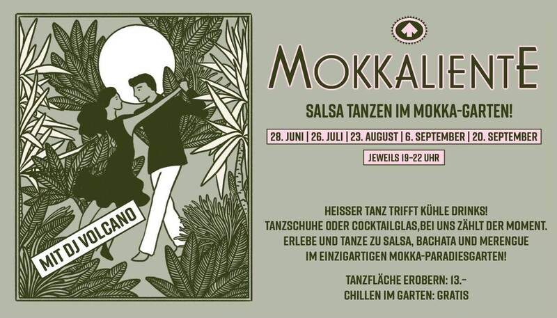 SALSA TANZEN IM MOKKA-GARTEN Heisser Tanz trifft kühle Drinks! Tanzschuhe oder CocktailgLas,bei uns zählt der Moment. Erlebe und tanze zu Salsa, Bachata und Merengue im einzigartigen Mokka-Paradiesgarten! DATEN: 6. SEPTEMBER 20. SEPTEMBER (ab 22:00 Konzert von Resident Mambo) JEWEILS 19–22 UHR TANZFLÄCHE EROBERN: 13.- (ABENDKASSE) | CHILLEN IM GARTEN: GRATIS MIT MUSIK VON DJ VOLCANO