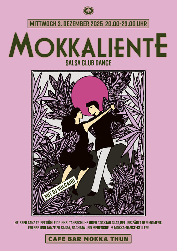 Heisser Tanz trifft kühle Drinks! Tanzschuhe oder Cocktail, bei uns zählt der Moment. Erlebe und tanze zu Salsa und Bachata auf den MOKKA-Dancefloor! 20;00 - 23:00 10 ChF Eintritt