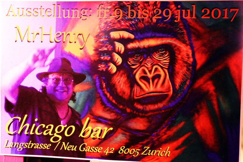 Interesante exposición del Artista MRHENRY con una destacada y larga carrera de muchos años como pintor y deseñador en Zürich nos sorprende una vez más con sus pinturas llenas de color y una fuerza impactante en el realismo de sus obras tan caracteristicas de su estilo incomparable. Exposición en el Chicago Bar del 9 al 29 de Junio 2017 Langstrasse / Neu Gasse 42, 8005 Zürich MRHENRY ELARTISTA TEL.076 625 56 47 MAIL : MRHENRY@GMX.CH HOMEPAGE : WWW.MRHENRY.CH FACEBOOK : MRHENRY ELARTISTA