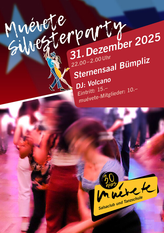 Der letzte Anlass im Jubiläumsjahr von Muévete: -Silvesterparty im «Sternen» Bümpliz -Beginn: 22.00 Uhr, Ende: 02.00 Uhr -DJ Volcano -Eintritt: 15 Franken, Mitglieder 10 Franken https://muevete.ch/salsaparties/
