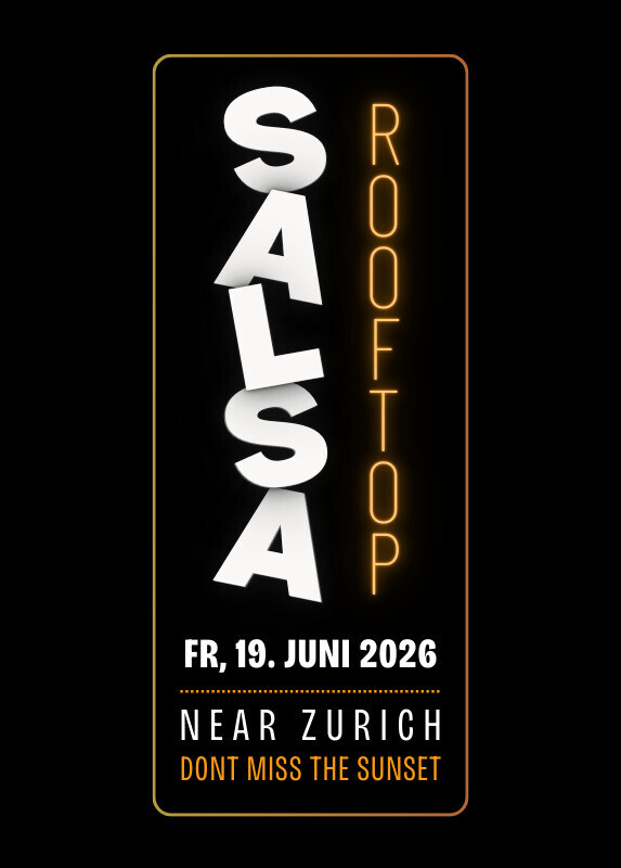 ----------------------------------------------------------- NEU * NEU * NEU * NEU * NEU * NEU * NEU * NEU ----------------------------------------------------------- SALSA ROOFTOP PARTY Ein neues Sommer Tanz-Erlebnis in der Region Zürich ::: Freitag, 19. Juni 2026 ::: 18:00 – 24:00 Uhr Weitere Termine: - Fr, 10. Juli 2026 - Sa, 12. September 2026 (Saison Abschluss Party) --------------------------- TICKETS & LOCATION --------------------------- Die Details verraten wir bald auf unseren Kanälen: WHATSAPP GRUPPE: https://chat.whatsapp.com/DCHYrapt7SW33QulFVT6ue INSTAGRAM: https://www.instagram.com/salsarooftop.ch *********************************** DON'T MISS THE SUNSET *********************************** https://salsarooftop.ch/?utm_source=salsa.ch
