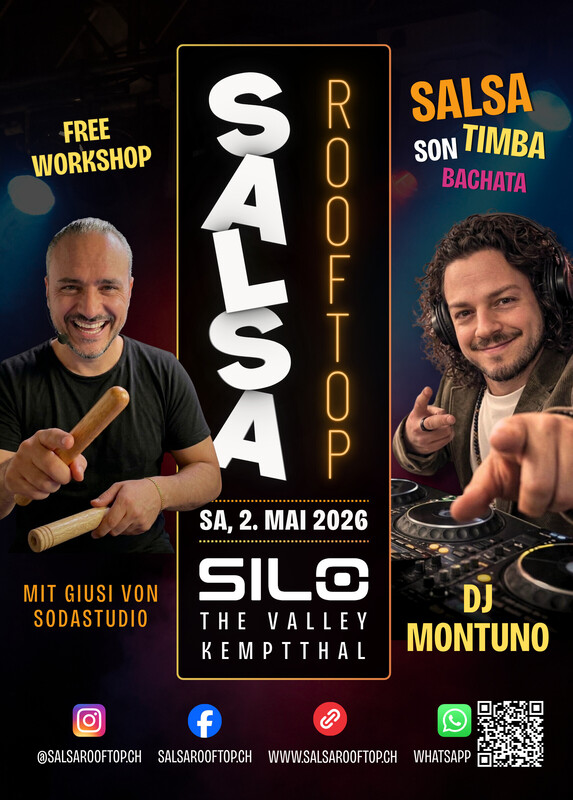 🥳 Endlich erhält Zürich eine eigene Salsa Rooftop Party. Salsa, Timba, Son und Bachata unter freiem Himmel. Tanzen bei Sonnenuntergang in einer der exklusivsten Locations der Region. ::: PREMIERE: Samstag, 2. Mai 2026 ::: Zeit: 18:00 – 24:00 Uhr Jetzt Tickets zum Vorverkaufspreis sichern: https://www.ticketino.com/de/Event/SALSA-ROOFTOP/214065 --------------------- HIGHLIGHTS --------------------- – EXKLUSIVE LOCATION: SILO Bar (The Valley, Kempttahl) - ROOFTOP: Tanzfläche unter freiem Himmel mit Sonnenuntergang - SCHLECHTWETTER-GARANTIE: Indoor-Möglichkeit - DJ MONTUNO: Salsa, Timba, Son und Bachata - FREE WORKSHOP: mit Giusi (SodaStudio) für alle Gäste - EINFACHE ANREISE: Eigener Bahnhof direkt vor der Tür & viele gratis Parkplätze ab 19 Uhr --------------------- PROGRAMM --------------------- 18:00 | Doors Open 18:15 | Free Workshop mit Giusi von SodaStudio 19:15 | Pre-Party Social (Dance Warmup, Connect, Drinks & Food) 19:45 | Party Start mit DJ MONTUNO 24:00 | Ende --------------------- TICKETS & PREISE --------------------- WICHTIG: Tickets sind AUSSCHLIESSLICH ONLINE verfügbar. Die Plätze auf dem Rooftop sind limitiert – First come, first serve. ✨ EARLY BIRD: CHF 20.- (Limitiert auf erste 80 Tickets) 🌟 DANACH NORMALPREIS: CHF 25.- (Solange es Plätze hat) Link zum Ticket-Shop: https://www.ticketino.com/de/Event/SALSA-ROOFTOP/214065 --------------------- WIR TANZEN BEI JEDEM WETTER --------------------- Die Party findet definitiv statt. Bei extrem schlechtem Wetter steht uns die Indoor-Lounge auf der gleichen Etage zur Verfügung. --------------------- LOCATION & ANREISE --------------------- 📍 Silo Bar (im The Valley), Kemptpark 12, 8310 Kemptthal 🚊 S-Bahn (S7 / S24) direkt vor der Tür (Bahnhof Kemptthal) 🚘 Kostenlose Parkplätze im VALLEY West Parking ab 19 Uhr --------------------- COMMUNITY & UPDATES --------------------- INSTAGRAM: https://www.instagram.com/salsarooftop.ch WHATSAPP GRUPPE: https://chat.whatsapp.com/DCHYrapt7SW33QulFVT6ue FACEBOOK: https://www.facebook.com/salsarooftop.ch WEBSITE: https://salsarooftop.ch/?utm_source=salsa.ch ********************************************* DON'T MISS THE FIRST DANCE. SEE YOU ON THE ROOFTOP! *********************************************