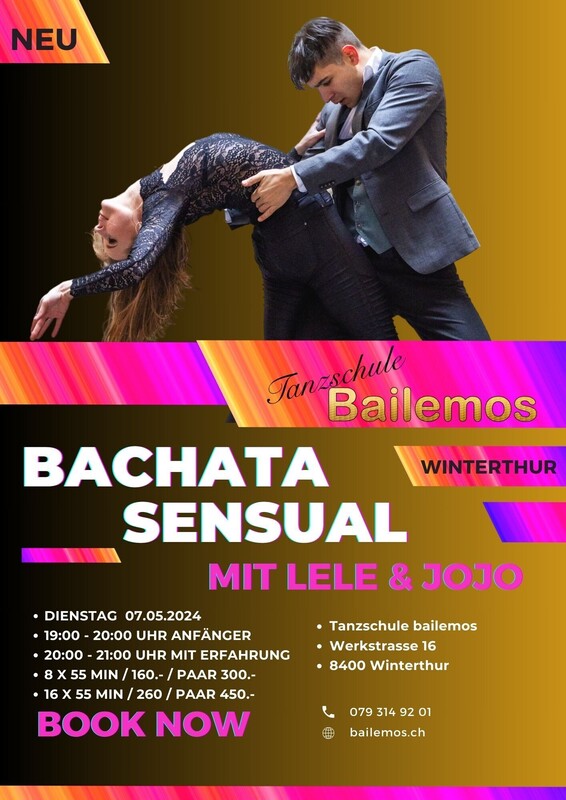 Wir beginnen 2 neue Bachatakurse mit Joshua & Lele: Beginn Dienstag 07.05.2024 19:00 - 20:00 Uhr Anfänger 8 x 55 min 160.- / Paar 300.- 20:00 - 21:00 Uhr Mit Kenntnissen 8 x 55 min 160.- / Paar 300.- https://bailemos.ch/bachata-kurse/