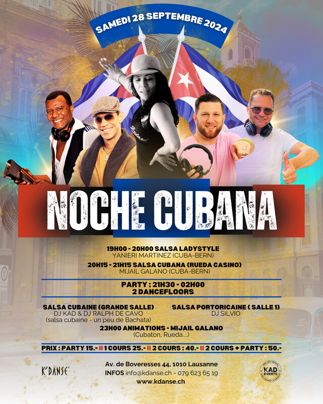 ★☆★NOCHE CUBANA★☆★ Kdanse Lausanne vous propose une Grande Soirée Cubaine ! Workshops & Party avec 2 Dancefloors PROGRAMME : ** 19h00 - 20h00 : Salsa Ladies'Styling workshop - YANIERI MARTINEZ (Cuba-Bern) (Pas de base requis pour participer) ** 20h15 - 21h15 : Salsa Cubaine (Rueda de Casino) - Mijail Galano (Cuba-Berne) (minimum 6 mois de Salsa requis pour participer) 21H30 - 02H00 : PARTY - 2 DANCEFLOORS **Grande Salle - SALSA CUBAINE (un peu de Bachata) Dj Kad & Dj Ralph De Cavo **Salle 1 - SALSA PORTORICAINE Dj Silvio 23h00: ANIMATIONS de Cubaton, Rueda par MIJAIL GALANO (Cuba-Berne) PRIX: Party 15.- 1 Cours 25.- 2 Cours 40.- 2 Cours + Party 50.- LIEU: KDANSE, Av de Boveresses 44, 1010 Lausanne INFOS: Kdanse : 079 623 65 19 - www.kdanse.ch Kad : 079 400 49 11 www.kad-events.ch